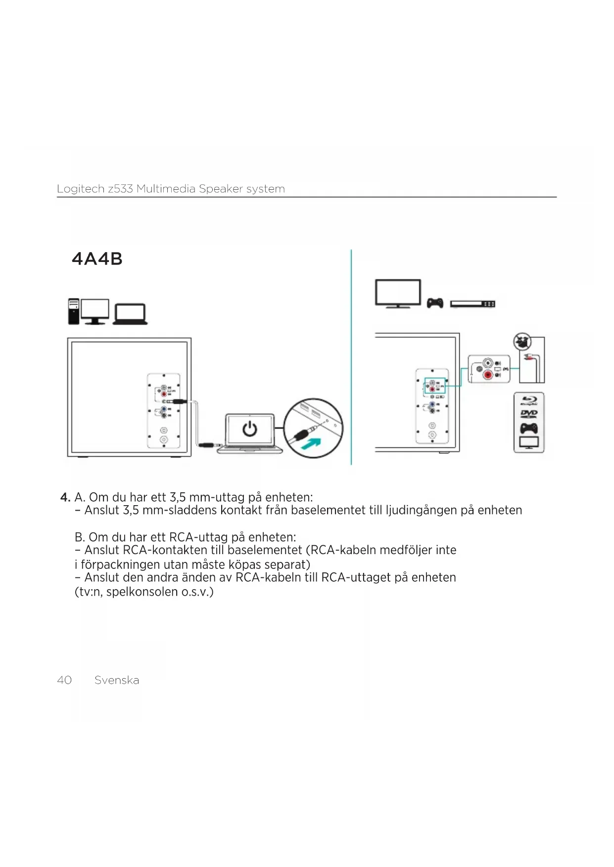 – Anslut 3,5 mm-sladdens kontakt från baselementet till ljudingången på enheten B. Om du har ett RCA-uttag på enheten: – Anslut RCA-kontakten till baselementet (RCA-kabeln medföljer inte i förpackningen utan måste köpas separat) – Anslut den andra änden av RCA-kabeln till RCA-uttaget på enheten (tv:n, spelkonsolen o.s.v.) 4A 4B
