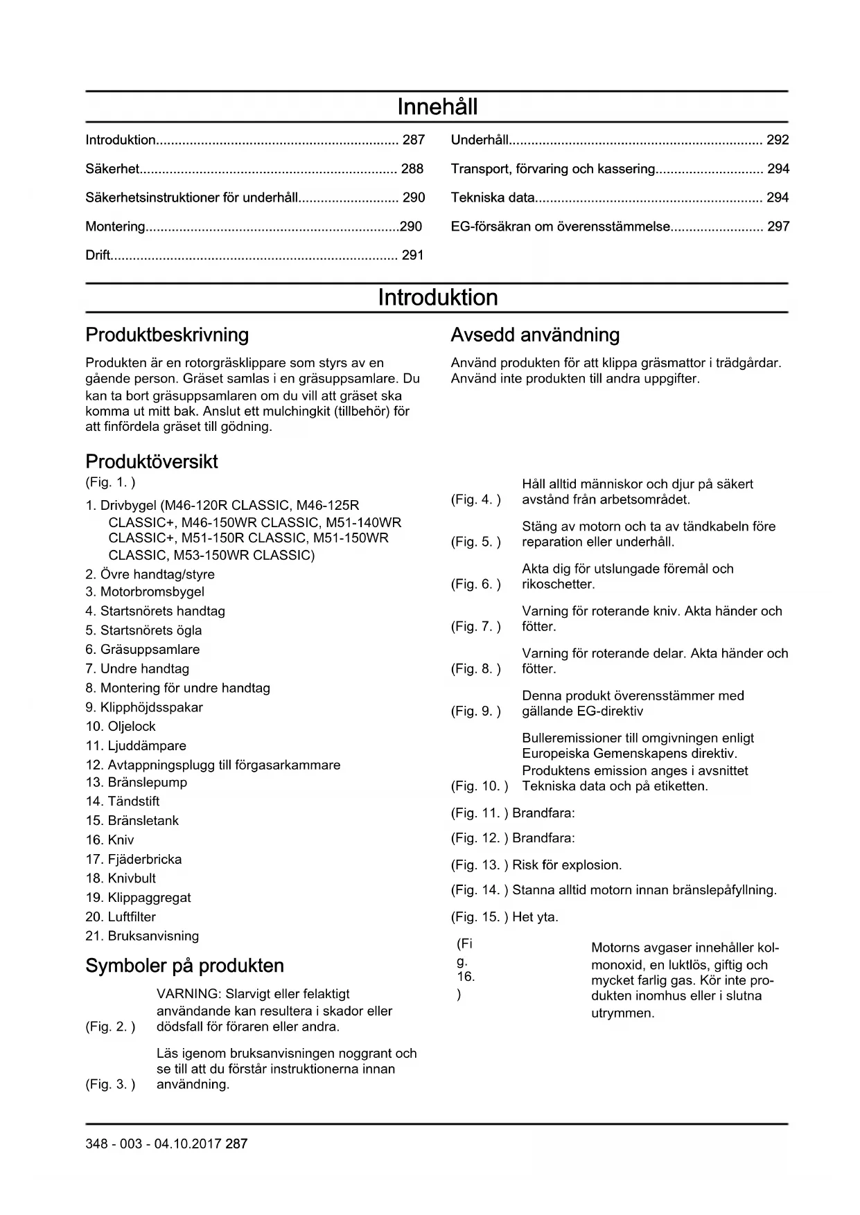 Symboler på produkten (Fig. 2. ) VARNING: Slarvigt eller felaktigt användande kan resultera i skador eller dödsfall för föraren eller andra. (Fig. 3. ) Läs igenom bruksanvisningen noggrant och se till att du förstår instruktionerna innan användning. (Fig. 4. ) Håll alltid människor och djur på säkert avstånd från arbetsområdet. (Fig. 5. ) Stäng av motorn och ta av tändkabeln före reparation eller underhåll. (Fig. 6. ) Akta dig för utslungade föremål och rikoschetter. (Fig. 7. ) Varning för roterande kniv. Akta händer och fötter. (Fig. 8. ) Varning för roterande delar. Akta händer och fötter. (Fig. 9. ) Denna produkt överensstämmer med gällande EG-direktiv (Fig. 10. ) Bulleremissioner till omgivningen enligt Europeiska Gemenskapens direktiv. Produktens emission anges i avsnittet Tekniska data och på etiketten. (Fig. 11. ) Brandfara: (Fig. 12. ) Brandfara: (Fig. 13. ) Risk för explosion. (Fig. 14. ) Stanna alltid motorn innan bränslepåfyllning. (Fig. 15. ) Het yta. (Fi