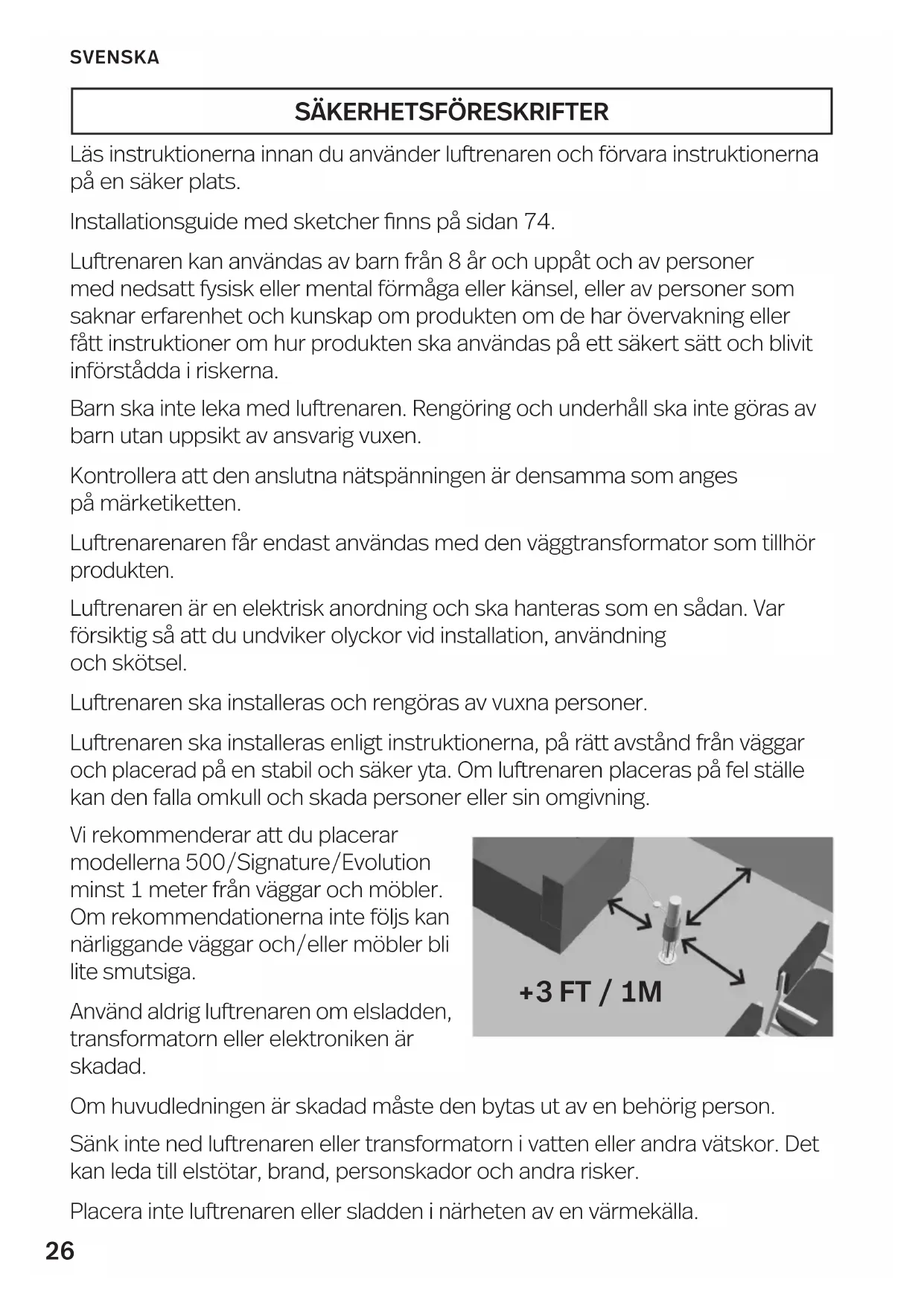 Läs instruktionerna innan du använder luftrenaren och förvara instruktionerna på en säker plats. Installationsguide med sketcher nns på sidan 74. Luftrenaren kan användas av barn från 8 år och uppåt och av personer med nedsatt fysisk eller mental förmåga eller känsel, eller av personer som saknar erfarenhet och kunskap om produkten om de har övervakning eller fått instruktioner om hur produkten ska användas på ett säkert sätt och blivit införstådda i riskerna. Barn ska inte leka med luftrenaren. Rengöring och underhåll ska inte göras av barn utan uppsikt av ansvarig vuxen. Kontrollera att den anslutna nätspänningen är densamma som anges på märketiketten. Luftrenarenaren får endast användas med den väggtransformator som tillhör produkten. Luftrenaren är en elektrisk anordning och ska hanteras som en sådan. Var försiktig så att du undviker olyckor vid installation, användning och skötsel. Luftrenaren ska installeras och rengöras av vuxna personer. Luftrenaren ska installeras enligt instruktionerna, på rätt avstånd från väggar och placerad på en stabil och säker yta. Om luftrenaren placeras på fel ställe kan den falla omkull och skada personer eller sin omgivning. Vi rekommenderar att du placerar modellerna 500/Signature/Evolution minst 1 meter från väggar och möbler. Om rekommendationerna inte följs kan närliggande väggar och/eller möbler bli lite smutsiga. Använd aldrig luftrenaren om elsladden, transformatorn eller elektroniken är skadad. Om huvudledningen är skadad måste den bytas ut av en behörig person. Sänk inte ned luftrenaren eller transformatorn i vatten eller andra vätskor. Det kan leda till elstötar, brand, personskador och andra risker. Placera inte luftrenaren eller sladden i närheten av en värmekälla. SVENSKA +3 FT / 1M27 Använd inte luftrenaren utomhus. Använd inte luftrenaren i fuktiga utrymmen. Använd inte luftrenaren tillsammans med färgade eller oljebaserade ljus. De avger sot som kan fastna på väggar och möbler. Du kan få en liten elektrisk stöt när du rör vid kollektorn. Det är helt ofarligt. Om du tycker att stöten är obehaglig drar du ut luftrenarens sladd innan du hanterar den, och använder petskyddet när luftrenaren