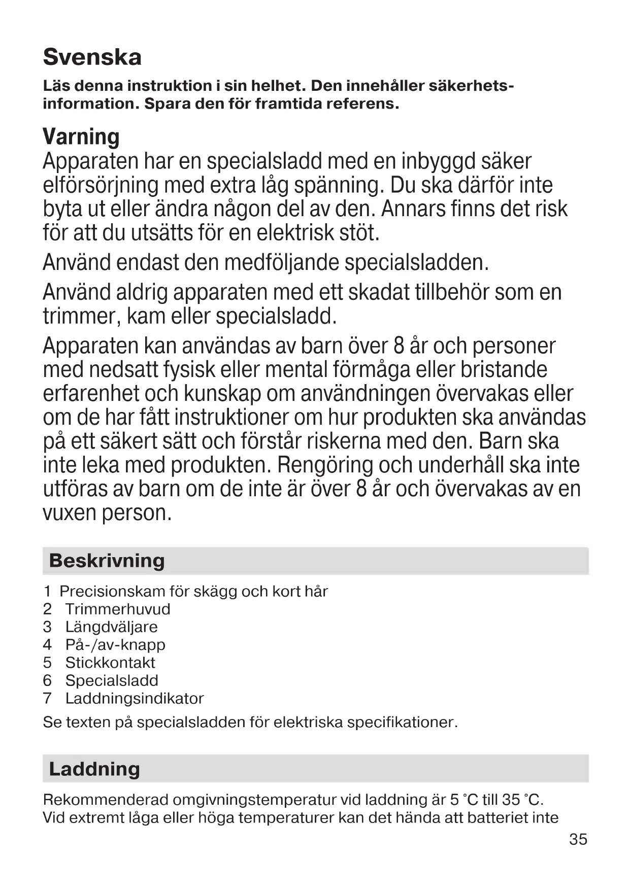 For varer kjøpt i Norge har kunden garanti i henhold til NEL’s Leverings- betingelser. 90794612_BT_3020_MN.indd 3490794612_BT_3020_MN.indd 34 30.03.16 10:5630.03.16 10:56 CSS APPROVED Effective Date 30Mar2016 GMT - Printed 30Jun2016 Page 34 of 4435 Svenska Läs denna instruktion i sin helhet. Den innehåller säkerhets- information. Spara den för framtida referens. Varning Apparaten har en specialsladd med en inbyggd säker elförsörjning med extra låg spänning. Du ska därför inte byta ut eller ändra någon del av den. Annars finns det risk för att du utsätts för en elektrisk stöt. Använd endast den medföljande specialsladden. Använd aldrig apparaten med ett skadat tillbehör som en trimmer, kam eller specialsladd. Apparaten kan användas av barn över 8 år och personer med nedsatt fysisk eller mental förmåga eller bristande erfarenhet och kunskap om användningen övervakas eller om de har fått instruktioner om hur produkten ska användas på ett säkert sätt och förstår riskerna med den. Barn ska inte leka med produkten. Rengöring och underhåll ska inte utföras av barn om de inte är över 8 år och övervakas av en vuxen person. Beskrivning 1 Precisionskam för skägg och kort hår 2 Trimmerhuvud 3 Längdväljare 4 På-/av-knapp 5 Stickkontakt 6 Specialsladd 7 Laddningsindikator Se texten på specialsladden för elektriska specifikationer. Laddning Rekommenderad omgivningstemperatur vid laddning är 5 °C till 35 °C. Vid extremt låga eller höga temperaturer kan det hända att batteriet inte 90794612_BT_3020_MN.indd 3590794612_BT_3020_MN.indd 35 30.03.16 10:5630.03.16 10:56 CSS APPROVED Effective Date 30Mar2016 GMT - Printed 30Jun2016 Page 35 of 4436 laddas ordentligt eller inte laddas alls. Rekommenderad omgivningstempe- ratur för trimning är 15°C till 35°C. Rakapparaten får inte utsättas för tempe- raturer överstigande 50°C under en längre tid.