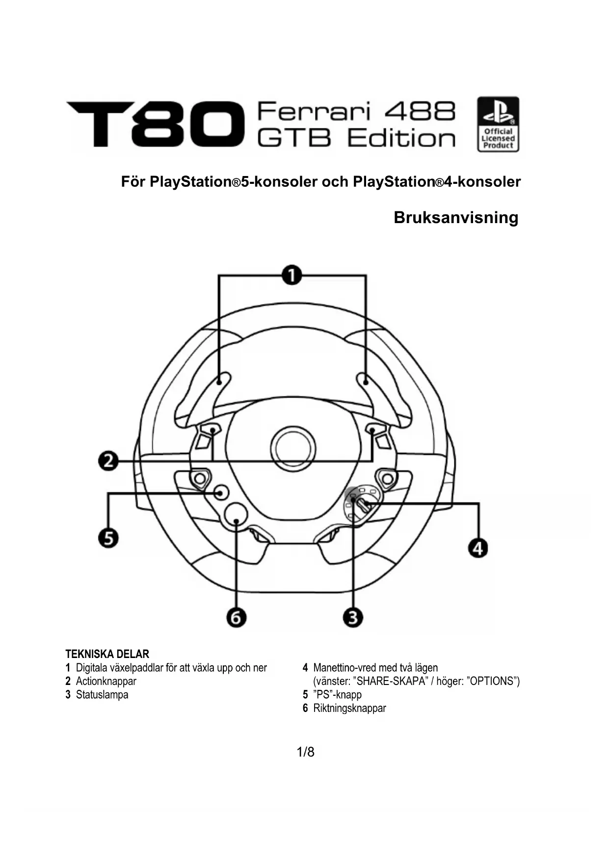 VIKTIG INFORMATION ANGÅENDE PS5™-KONSOLEN OCH PS4™-KONSOLEN Glöm inte att trycka på ”PS”-knappen (5) för att kunna använda ratten.5/8 AUTOMATISK RATTEMULERING PÅ PS5™-KONSOLEN OCH PS4™-KONSOLEN I spel till PlayStation®5-konsoler och PlayStation®4-konsoler känns T80 Racing Wheel igen som en riktig ratt och inte som en handkontroll, vilket ger bättre responsivitet och ökad precision. - För att ändra mappningen går du till Options-menyn i spelet och väljer WHEEL SETTINGS. - För att ändra känsligheten på rattens styrning går du till Options-menyn i spelet och väljer WHEEL SETTINGS. LISTA MED SPEL TILL PLAYSTATION®5-KONSOLER OCH PLAYSTATION®4-KONSOLER En lista med spel till PS5™-konsoler och PS4™-konsoler som är kompatibla med ratten finns på https://support.thrustmaster.com. Gå till Racingrattar / T80 Racing Wheel, och välj sedan Inställningar för spel. Denna lista uppdateras regelbundet.