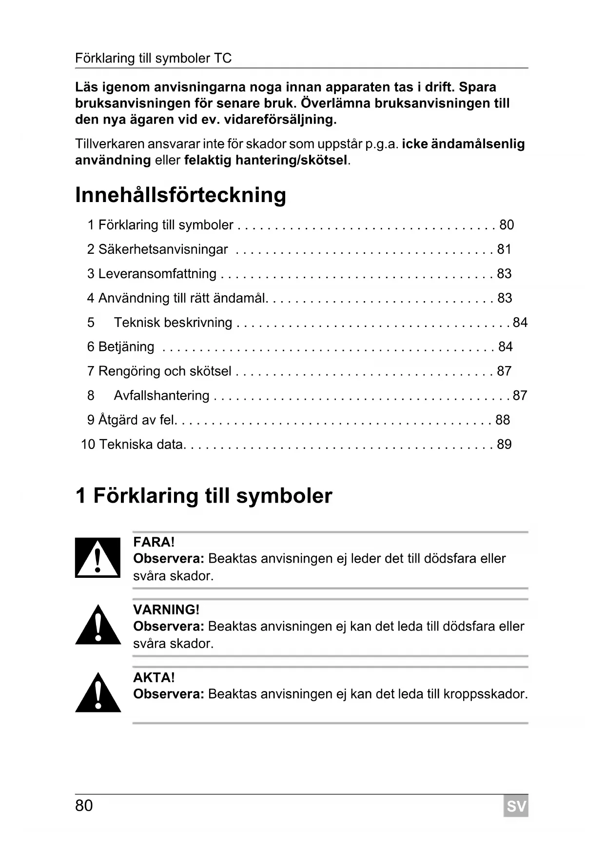 FARA! Ta inte tag i avskalade ledningar med händerna. Detta gäller framför allt vid drift med växelström.SV TC Leveransomfattning