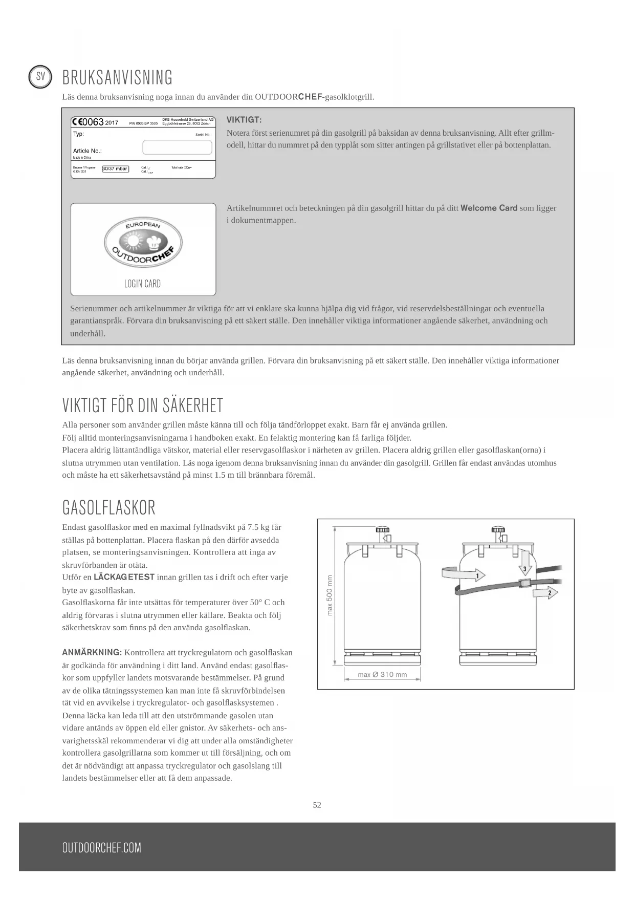 - Se en forhandlerliste på vores hjemmeside på OUTDOORCHEF.COM ** Serienummeret og artikelnummeret står på datamærkaten på din grill (se første afsnit i denne BRUGSANVISNING).OUTDOORCHEF.COM BRUKSANVISNING Läs denna bruksanvisning noga innan du använder din OUTDOORCHEF-gasolklotgrill. Läs denna bruksanvisning innan du börjar använda grillen. Förvara din bruksanvisning på ett säkert ställe. Den innehåller viktiga informationer angående säkerhet, användning och underhåll.