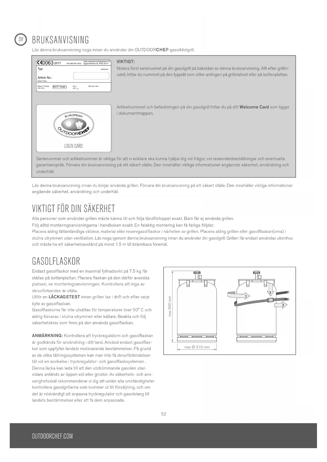 - Se en forhandlerliste på vores hjemmeside på OUTDOORCHEF.COM ** Serienummeret og artikelnummeret står på datamærkaten på din grill (se første afsnit i denne BRUGSANVISNING).OUTDOORCHEF.COM BRUKSANVISNING Läs denna bruksanvisning noga innan du använder din OUTDOORCHEF-gasolklotgrill. Läs denna bruksanvisning innan du börjar använda grillen. Förvara din bruksanvisning på ett säkert ställe. Den innehåller viktiga informationer angående säkerhet, användning och underhåll.