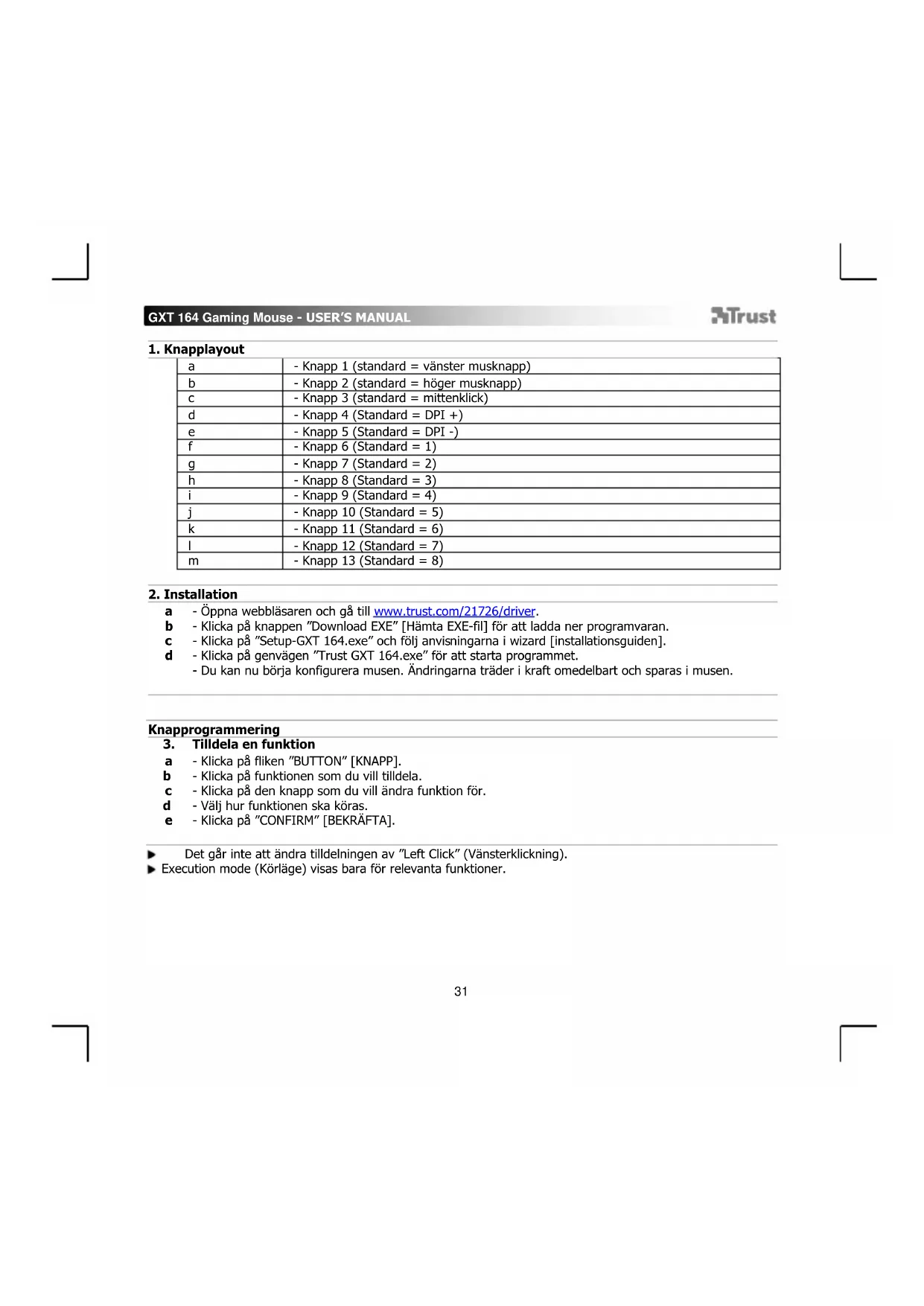 - Öppna webbläsaren och gå till www.trust.com/21726/driver. - Klicka på knappen ”Download EXE” [Hämta EXE-fil] för att ladda ner programvaran. - Klicka på ”Setup-GXT 164.exe” och följ anvisningarna i wizard [installationsguiden]. - Klicka på genvägen ”Trust GXT 164.exe” för att starta programmet. - Du kan nu börja konfigurera musen. Ändringarna träder i kraft omedelbart och sparas i musen.