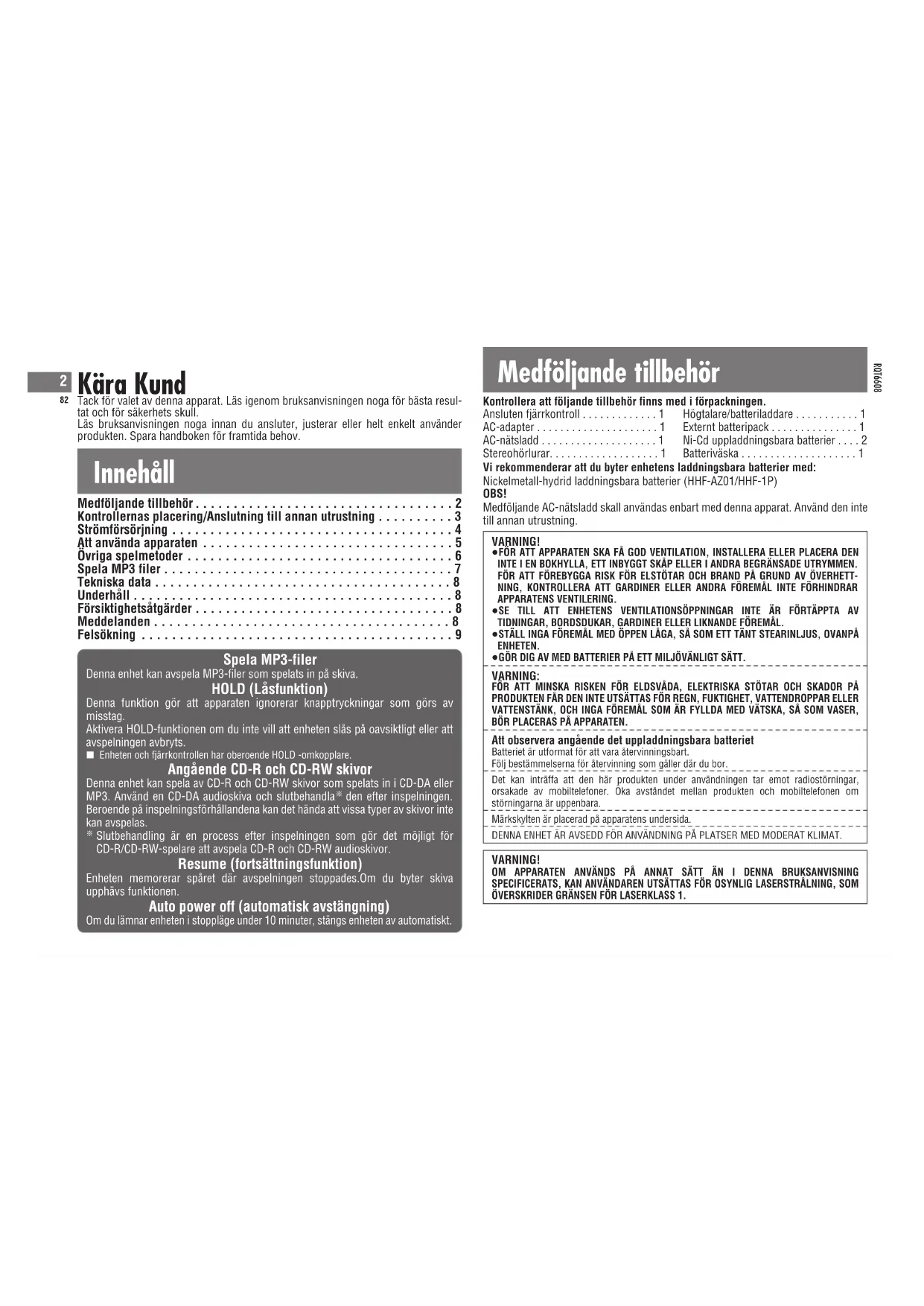 - Batteriväska Kontrollera att följande tillbehör finns med i förpackningen. Vi rekommenderar att du byter enhetens laddningsbara batterier med: Nickelmetall-hydrid laddningsbara batterier (HHF-AZ01/HHF-1P) OBS! Medföljande AC-nätsladd skall användas enbart med denna apparat. Använd den inte till annan utrustning. Innehåll VARNING! OM APPARATEN ANVÄNDS PÅ ANNAT SÄTT ÄN I DENNA BRUKSANVISNING SPECIFICERATS, KAN ANVÄNDAREN UTSÄTTAS FÖR OSYNLIG LASERSTRÅLNING, SOM ÖVERSKRIDER GRÄNSEN FÖR LASERKLASS 1. VARNING! ≥FÖR ATT APPARATEN SKA FÅ GOD VENTILATION, INSTALLERA ELLER PLACERA DEN INTE I EN BOKHYLLA, ETT INBYGGT SKÅP ELLER I ANDRA BEGRÄNSADE UTRYMMEN. FÖR ATT FÖREBYGGA RISK FÖR ELSTÖTAR OCH BRAND PÅ GRUND AV ÖVERHETT- NING, KONTROLLERA ATT GARDINER ELLER ANDRA FÖREMÅL INTE FÖRHINDRAR APPARATENS VENTILERING. ≥SE TILL ATT ENHETENS VENTILATIONSÖPPNINGAR INTE ÄR FÖRTÄPPTA AV TIDNINGAR, BORDSDUKAR, GARDINER ELLER LIKNANDE FÖREMÅL. ≥STÄLL INGA FÖREMÅL MED ÖPPEN LÅGA, SÅ SOM ETT TÄNT STEARINLJUS, OVANPÅ ENHETEN. ≥GÖR DIG AV MED BATTERIER PÅ ETT MILJÖVÄNLIGT SÄTT. VARNING: FÖR ATT MINSKA RISKEN FÖR ELDSVÅDA, ELEKTRISKA STÖTAR OCH SKADOR PÅ PRODUKTEN FÅR DEN INTE UTSÄTTAS FÖR REGN, FUKTIGHET, VATTENDROPPAR ELLER VATTENSTÄNK, OCH INGA FÖREMÅL SOM ÄR FYLLDA MED VÄTSKA, SÅ SOM VASER, BÖR PLACERAS PÅ APPARATEN. Att observera angående det uppladdningsbara batteriet Batteriet är utformat för att vara återvinningsbart. Följ bestämmelserna för återvinning som gäller där du bor. Det kan inträffa att den här produkten under användningen tar emot radiostörningar, orsakade av mobiltelefoner. Öka avståndet mellan produkten och mobiltelefonen om störningarna är uppenbara. Märkskylten är placerad på apparatens undersida. DENNA ENHET ÄR AVSEDD FÖR ANVÄNDNING PÅ PLATSER MED MODERAT KLIMAT. Kära Kund Tack för valet av denna apparat. Läs igenom bruksanvisningen noga för bästa resul- tat och för säkerhets skull. Läs bruksanvisningen noga innan du ansluter, justerar eller helt enkelt använder produkten. Spara handboken för framtida behov. Spela MP3-filer Denna enhet kan avspela MP3-filer som spelats in på skiva. HOLD (Låsfunktion) Denna funktion gör att apparaten ignorerar knapptryckningar som görs av misstag. Aktivera HOLD-funktionen om du inte vill att enheten slås på oavsiktligt eller att avspelningen avbryts. ∫ Enheten och fjärrkontrollen har oberoende HOLD -omkopplare. Angående CD-R och CD-RW skivor Denna enhet kan spela av CD-R och CD-RW skivor som spelats in i CD-DA eller MP3. Använd en CD-DA audioskiva och slutbehandla p. 1
