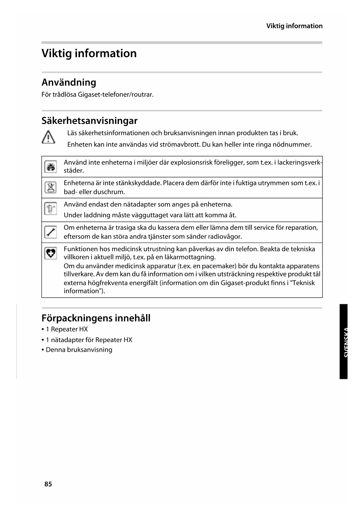 - Denna bruksanvisning Läs säkerhetsinformationen och bruksanvisningen innan produkten tas i bruk. Enheten kan inte användas vid strömavbrott. Du kan heller inte ringa nödnummer. Använd inte enheterna i miljöer där explosionsrisk föreligger, som t.ex. i lackeringsverk- städer. Enheterna är inte stänkskyddade. Placera dem därför inte i fuktiga utrymmen som t.ex. i bad- eller duschrum. Använd endast den nätadapter som anges på enheterna. Under laddning måste vägguttaget vara lätt att komma åt. Om enheterna är trasiga ska du kassera dem eller lämna dem till service för reparation, eftersom de kan störa andra tjänster som sänder radiovågor. Funktionen hos medicinsk utrustning kan påverkas av din telefon. Beakta de tekniska villkoren i aktuell miljö, t.ex. på en läkarmottagning. Om du använder medicinsk apparatur (t.ex. en pacemaker) bör du kontakta apparatens tillverkare. Av dem kan du få information om i vilken utsträckning respektive produkt tål externa högfrekventa energifält (information om din Gigaset-produkt finns i "Teknisk information").86 Template Go, Version 1, 01.07.2014 / ModuleVersion 1.0 Inledning Repeater HX / ALL IM sv / A31008-N603-R101-1-SU19 / Grep-swd_HX.fm / 3/28/19 Inledning Med en Gigaset-repeater kan du utöka räckvidden och mottagningsstyrkan hos din basstation. Upp till sex Gigaset Repeater-enheter kan användas samtidigt på en basstation. Det maximala antalet beror på basstationen och typen av DECT-överföring (krypterad/okrypterad). I det utökade mottagningsområdet kan maximalt två samtal föras samtidigt. Det maximala antalet anslutna handenheter på basstationen påverkas inte av Gigaset Repeater. Funktioner hos Repeater HX: