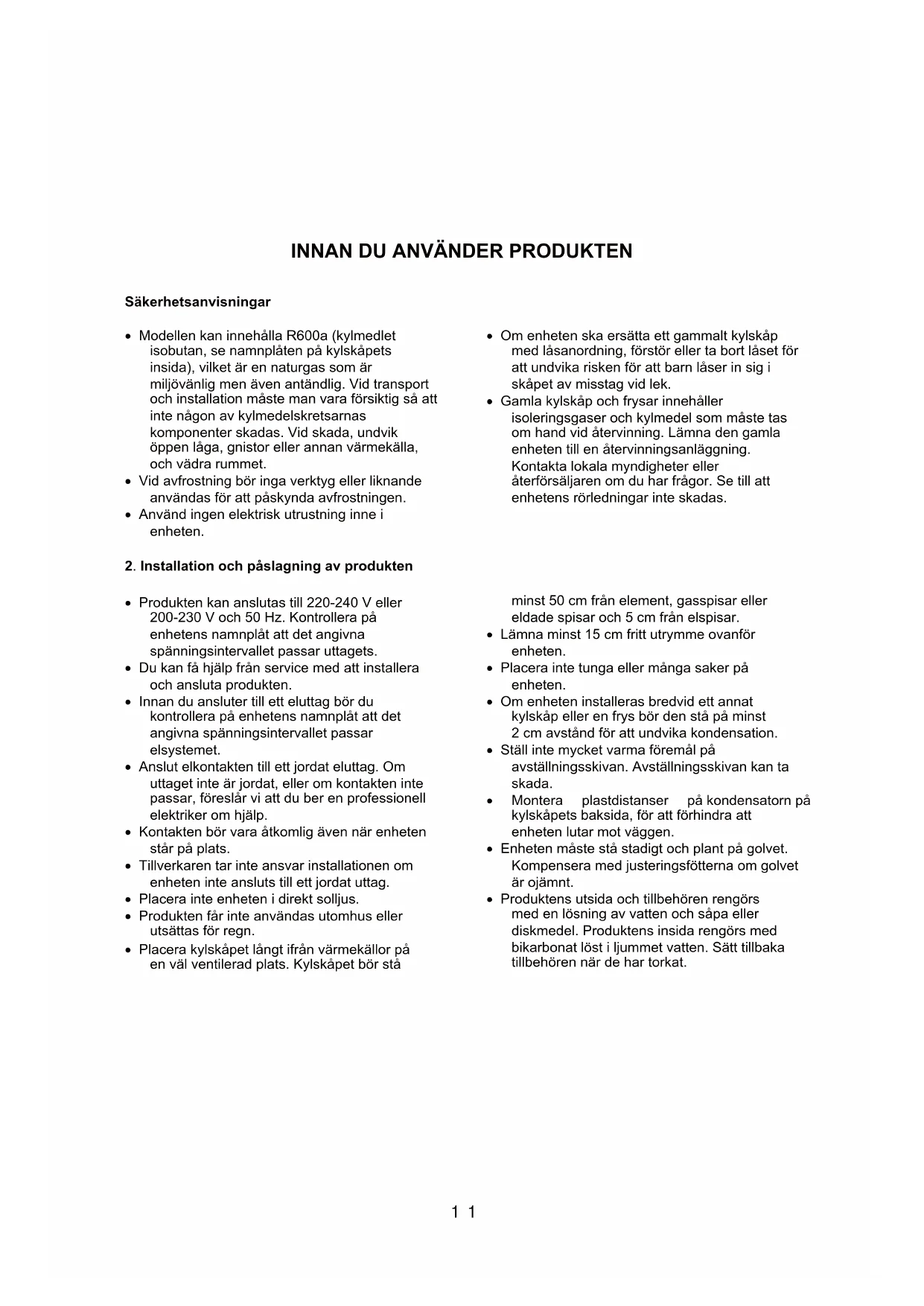 x Produkten kan anslutas till 220-240 V eller 200-230 V och 50 Hz. Kontrollera på enhetens namnplåt att det angivna spänningsintervallet passar uttagets. x Du kan få hjälp från service med att installera och ansluta produkten. x Innan du ansluter till ett eluttag bör du kontrollera på enhetens namnplåt att det angivna spänningsintervallet passar elsystemet. x Anslut elkontakten till ett jordat eluttag. Om uttaget inte är jordat, eller om kontakten inte passar, föreslår vi att du ber en professionell elektriker om hjälp. x Kontakten bör vara åtkomlig även när enheten står på plats. x Tillverkaren tar inte ansvar installationen om enheten inte ansluts till ett jordat uttag. x Placera inte enheten i direkt solljus. x Produkten får inte användas utomhus eller utsättas för regn. x Placera kylskåpet långt ifrån värmekällor på en väl ventilerad plats. Kylskåpet bör stå minst 50 cm från element, gasspisar eller eldade spisar och 5 cm från elspisar. x Lämna minst 15 cm fritt utrymme ovanför enheten. x Placera inte tunga eller många saker på enheten. x Om enheten installeras bredvid ett annat kylskåp eller en frys bör den stå på minst 2 cm avstånd för att undvika kondensation. x Ställ inte mycket varma föremål på avställningsskivan. Avställningsskivan kan ta skada. x Montera plastdistanser på kondensatorn på kylskåpets baksida, för att förhindra att enheten lutar mot väggen. x Enheten måste stå stadigt och plant på golvet. Kompensera med justeringsfötterna om golvet är ojämnt. x Produktens utsida och tillbehören rengörs med en lösning av vatten och såpa eller diskmedel. Produktens insida rengörs med bikarbonat löst i ljummet vatten. Sätt tillbaka tillbehören när de har torkat.