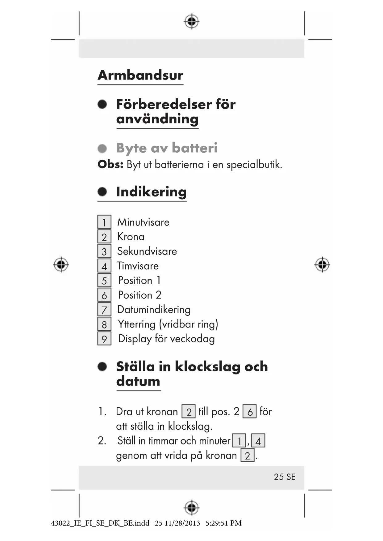 Risk för miljöskador pga felaktig avfallshantering av batterier! Batterier får inte kastas i hushållssoporna. 43022_IE_FI_SE_DK_BE.indd 29 11/28/2013 5:29:51 PM30 SE Batterierna kan innehålla giftiga tungmetaller och skall behandla som specialavfall. De kemiska symbolerna för tungmetaller är följande: Cd = Kadmium, Hg = Kvicksilver, Pb = Bly. Lämna därför förbrukade batterier till kommunens återvinningsstation. GARANTI Denna apparat har tillverkats med omsorg enligt stränga kvalitetskrav och kontrollerats noggrant före leverans. Om fel uppstår på produkten gäller dina lagstadgade rättigheter gentemot säljaren. Dessa lagstadgade rättigheter begränsas inte av vår garanti, som redovisas nedan. Du erhåller 3 års garanti på denna apparat från och med köpdatum. Garantitiden börjar på inköpsdagen. Spara originalkvittot. Denna handling behövs som bevis för köpet. Om ett material- eller tillverkningsfel uppstår på produkten inom tre år från 43022_IE_FI_SE_DK_BE.indd 30 11/28/2013 5:29:51 PM31 SE köpdatum, reparerar eller ersätter vi efter eget gottfinnande produkten utan extra kostnad. Denna garanti förfaller om produkten skadas, används på fel sätt eller inte underhålls. Garantin gäller för material- eller tillverkningsfel. Denna garanti omfattar inte produktkomponenter som utsätts för normalt slitage och därför betraktas som slitdelar (t.ex. batterier). Uteslutna är även skador på ömtåliga delar, som t.ex. brytare, batteripack eller delar tillverkade av glas. En försämrad vattentäthet omfattas inte av garantin. Vattentäthet är ingen bestående egenskap och bör därför underhållas regelbundet. Beakta att garantianspråken förfaller om icke auktoriserade personer öppnar eller reparerar din klocka. 43022_IE_FI_SE_DK_BE.indd 31 11/28/2013 5:29:51 PM32 DK Armbåndsur