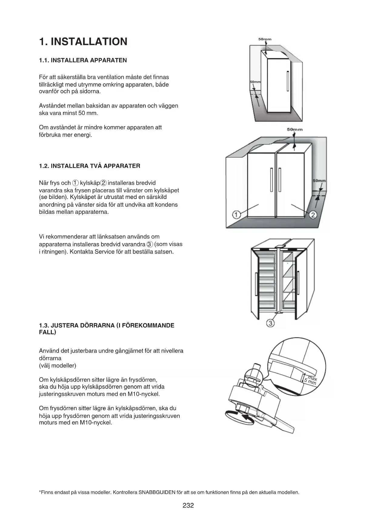 FALL) Använd det justerbara undre gångjärnet för att nivellera dörrarna (väljmodeller) Omkylskåpsdörrensitterlägreänfrysdörren, ska du höja upp kylskåpsdörren genom att vrida justeringsskruvenmotursmedenM10-nyckel. Omfrysdörrensitterlägreänkylskåpsdörren,skadu höja upp frysdörren genom att vrida justeringsskruven motursmedenM10-nyckel. *Finnsendastpåvissamodeller.KontrolleraSNABBGUIDENförattseomfunktionenfinnspådenaktuellamodellen. 50mm 50mm 5 mm max233