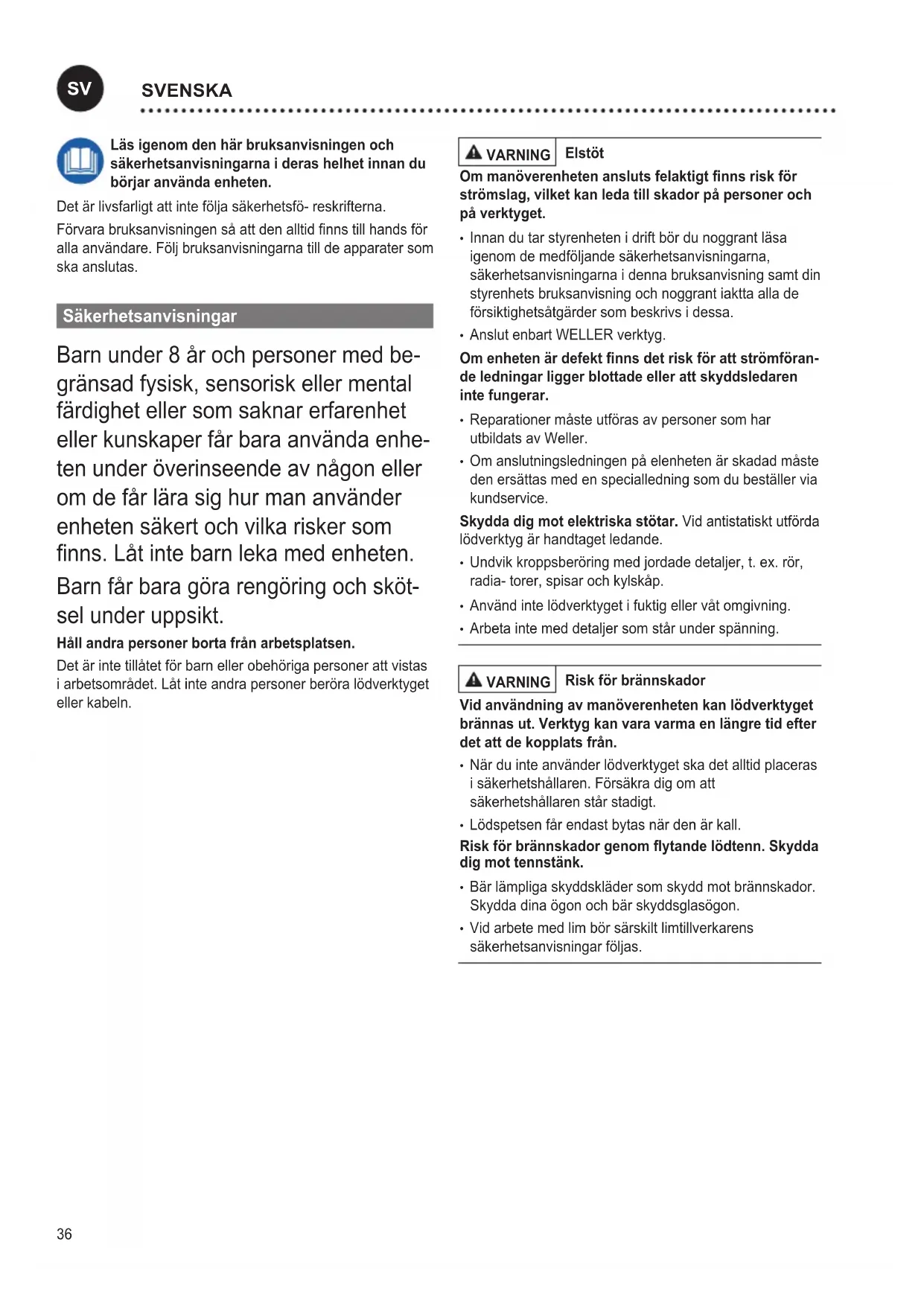 - Bringa inga brännbara förmål, vätskor eller gaser i närhetenavdetvarmalödverktyget. Förvara lödverktyget på säkert ställe.Enheterochverktyg som inte används bör förvaras på ett torrt och högt beläget ellerlåstställe,utomräckhållförbarn.Lödverktygsominte användsskaförvarasmedspänningochtryckfrånkopplade. Nätkabeln får endast sättas i därtill tillåtna nätuttag eller adaptrar. Kontrollera om nätspänningen överensstämmer meduppgifternapåtypskylten.Maskinenskallvara frånslagen när kontakten anslutes till vägguttaget. Använd inte kabeln för annat än den är avsedd för.Bär aldrig enheten genom att hålla den i kabeln. Använd inte kabelnförattdrautkontaktenuruttaget.Skyddakabelnmot värme, olja och skarpa kanter. Var uppmärksam. Var uppmärksam på vad du gör. Gå förnuftigttillväganärduarbetar.Användinteverktygetnärdu är okoncentrerad. Undvik onormal arbetsställning. Utforma arbetsplatsen ergonomiskt riktigt. Tänk på att stå och arbeta på ett ergono- miskt sätt så skonar du kroppen. Lödverktyget får endast tas i drift när den är i fullgott tekniskt skick.Skyddsanordningarfårintetasurdrift. Fel och defekter måste omedelbart åtgärdas. Innan du börjaranvändaenheten/verktygetmåstedualltidnoggrant kontrolleraattskyddsanordningarnaärigottskickoch fungerar som de ska. Kontrollera att rörliga delar fungerar som de ska och att de inte har fastnat, samt att inga delar är skadade.Samtligadelarskamonteraskorrektochuppfylla alla krav. Endast på så vis kan enhetens felfria funktion garanteras. Använd rätt verktyg. Använd endast tillbehör och tillsat- senhetersomnnsitillbehörslistanellersomgodkäntsav tillverkaren. Använd endast tillbehör och tillsatsenheter från WELLER på originalenheter från WELLER. Om du använder andraverktygellerandratillbehörkandetinnebärariskför personskada. Säkra verktyget. Använd fastspänningsanordningar till att hållafastarbetsstycket. Använd lödröksutsug.Omdetnnsanordningarför anslutning av lödröksutsug tillgängliga, kontrollera att dessa är anslutna och att de används på rätt sätt. Använd Maskinen Enligt Anvisningarna FörsörjningsenhetWELLERlödverktyg.Användendast lödstationen enligt de metoder och villkor för lödning och som anges i bruksanvisningen. Denna enhet får endast användas inomhus i rumstempera- tur.Skyddadetfrånfuktochdirektsolljus. Användarkategorier Vissaarbetsmomentinnebärenstörreolycksriskochfår därför endast utföras av utbildad fackpersonal. Arbetsmoment Användarkategorier Inställning av lödpara- metrar Fackpersonal med teknisk utbildning Byteavelektriskareser- vdelar Elektriker Inställning av underhålls- intervall Säkerhetsexpert Operatör Lekman Operatör Byteavelektriskareser- vdelar Tekniklärlingar under överinseende av utbildad fackman skötsel och underhåll VARNING Tag ut kontakten ur vägguttaget, om maskinen skall åtgärdas. Låt apparaten svalna. Kontrollera regelbundet alla anslutna kablar och slangar. Skadadeelverktygmåsteomedelbarttasurbruk. Reparationer måste utföras av personer som har utbildats av Weller. Använd endast originalreservdelar. Garanti Köparen kan reklamera produkten upp till ett år efter det att den har levererats. Detta gäller inte köparens ångerrätt enligt §§ 478, 479 BGB. Vi tar enbart ansvar för den av oss utfärdade garantin om kvalitets- och hållbarhetsgaranti skriftligen har angivits av ossunderbegreppet”garanti”. Omverktygetharanväntsfelaktigtelleromokvalicerade personer har gjort ingrepp i det, upphör garantin att gälla. Mer information hittar du på www.weller-tools.com.
