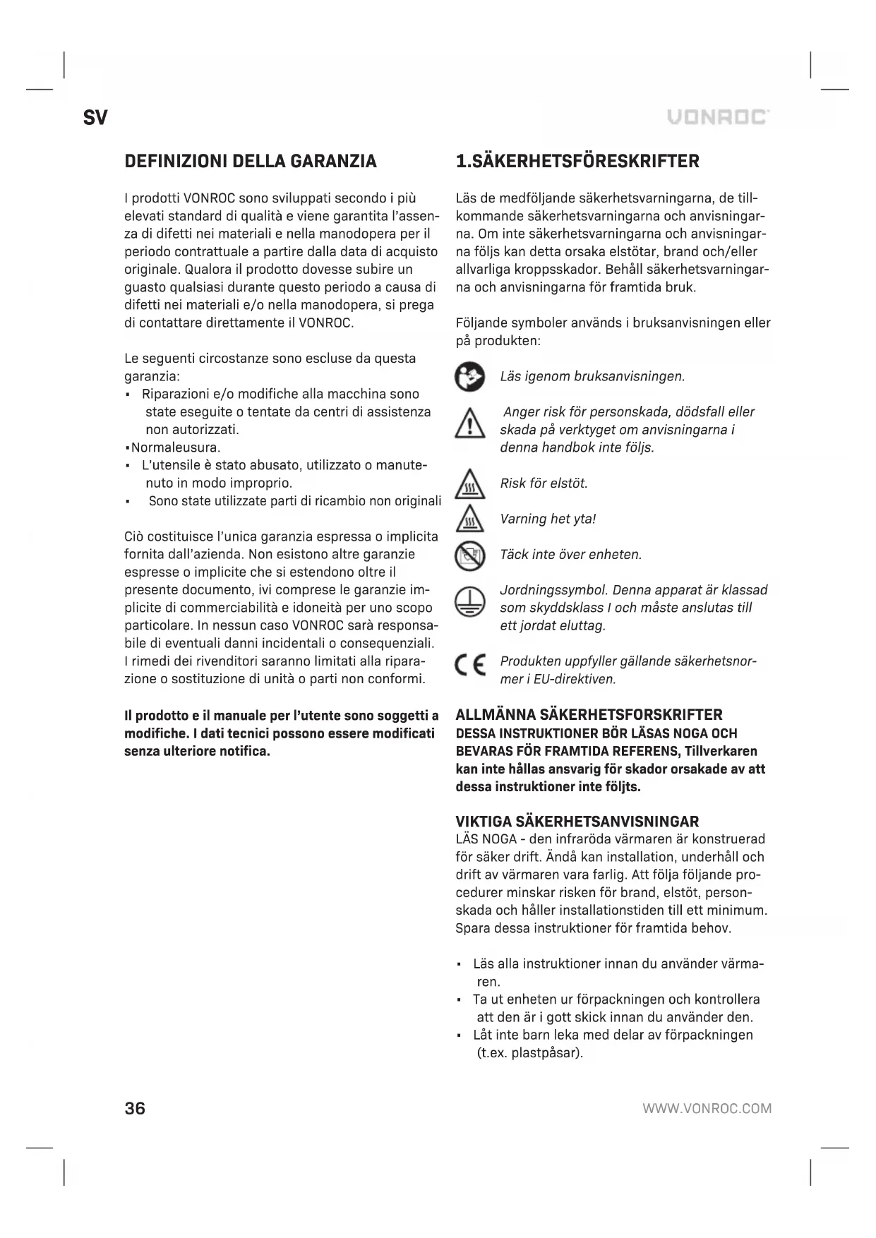 GARANTI VONROC produkter är utvecklade enligt högsta kvali- tetsstandard och garanteras vara utan defekter både vad gäller material och tillverkning under den period som stipuleras enligt lag med början från ursprun- gligt inköpsdatum. Om något fel uppstår på produk- ten under denna period på grund av material- och/ eller tillverkningsfel skall VONROC kontaktas direkt. Följande omständigheter exkluderas från denna garanti: