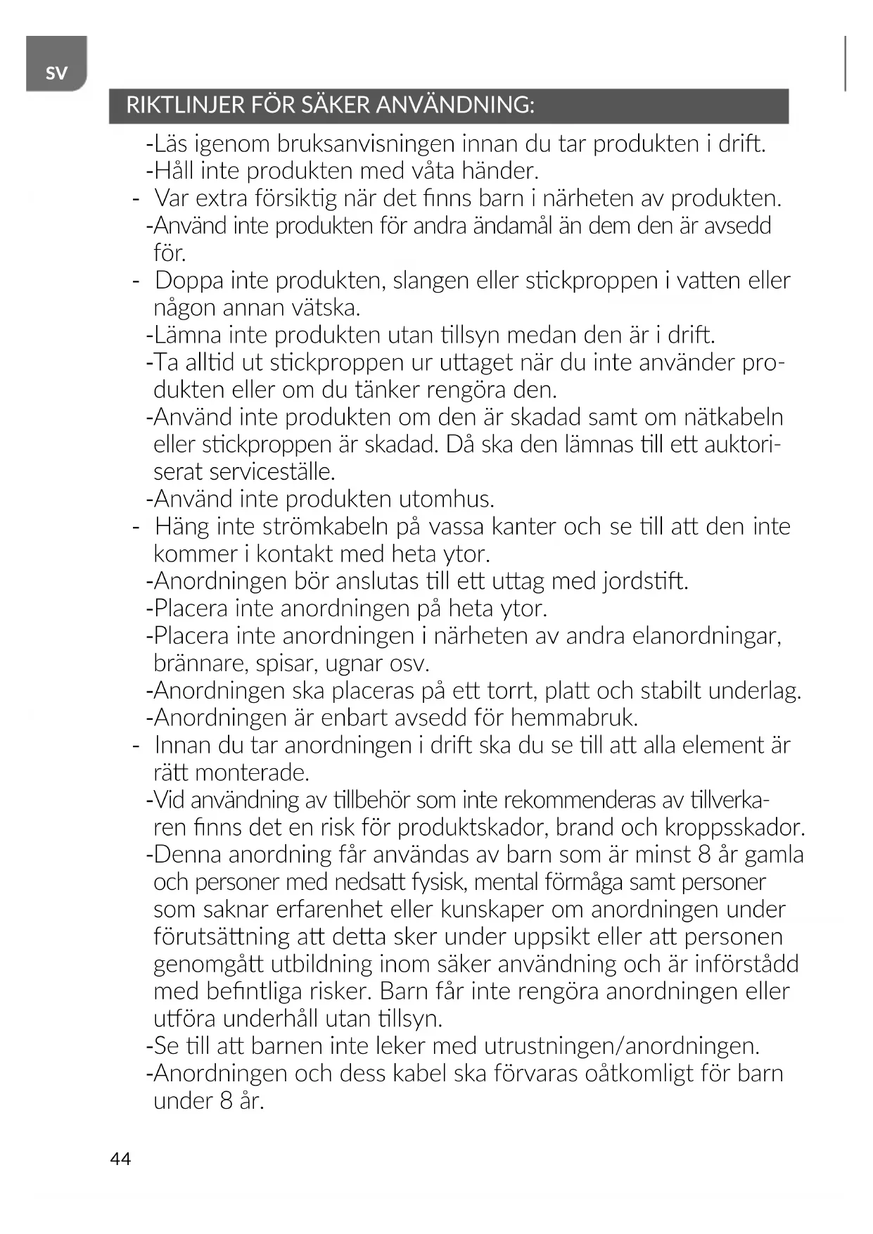 Anordningen och dess kabel ska förvaras oåtkomligt för barn under 8 år.45