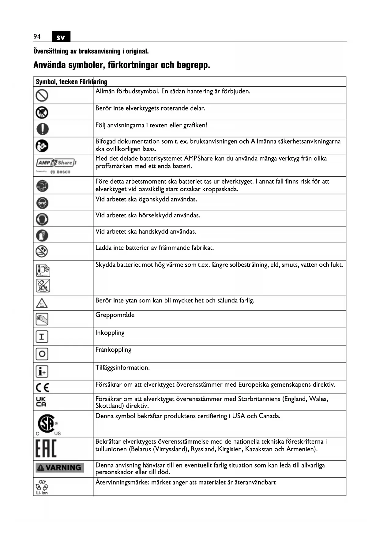 Översättning av bruksanvisning i original. Använda symboler, förkortningar och begrepp. Symbol, tecken Förklaring Allmän förbudssymbol. En sådan hantering är förbjuden. Berör inte elverktygets roterande delar. Följ anvisningarna i texten eller grafiken! Bifogad dokumentation som t. ex. bruksanvisningen och Allmänna säkerhetsanvisningarna ska ovillkorligen läsas. Med det delade batterisystemet AMPShare kan du använda många verktyg från olika proffsmärken med ett enda batteri. Före detta arbetsmoment ska batteriet tas ur elverktyget. I annat fall finns risk för att elverktyget vid oavsiktlig start orsakar kroppsskada. Vid arbetet ska ögonskydd användas. Vid arbetet ska hörselskydd användas. Vid arbetet ska handskydd användas. Ladda inte batterier av främmande fabrikat. Skydda batteriet mot hög värme som t.ex. längre solbestrålning, eld, smuts, vatten och fukt. Berör inte ytan som kan bli mycket het och sålunda farlig. Greppområde Inkoppling Frånkoppling Tilläggsinformation. Försäkrar om att elverktyget överensstämmer med Europeiska gemenskapens direktiv. Försäkrar om att elverktyget överensstämmer med Storbritanniens (England, Wales, Skottland) direktiv. Denna symbol bekräftar produktens certifiering i USA och Canada. Bekräftar elverktygets överensstämmelse med de nationella tekniska föreskrifterna i tullunionen (Belarus (Vitryssland), Ryssland, Kirgisien, Kazakstan och Armenien). Denna anvisning hänvisar till en eventuellt farlig situation som kan leda till allvarliga personskador eller till död. Återvinningsmärke: märket anger att materialet är återanvändbart max.50°C95