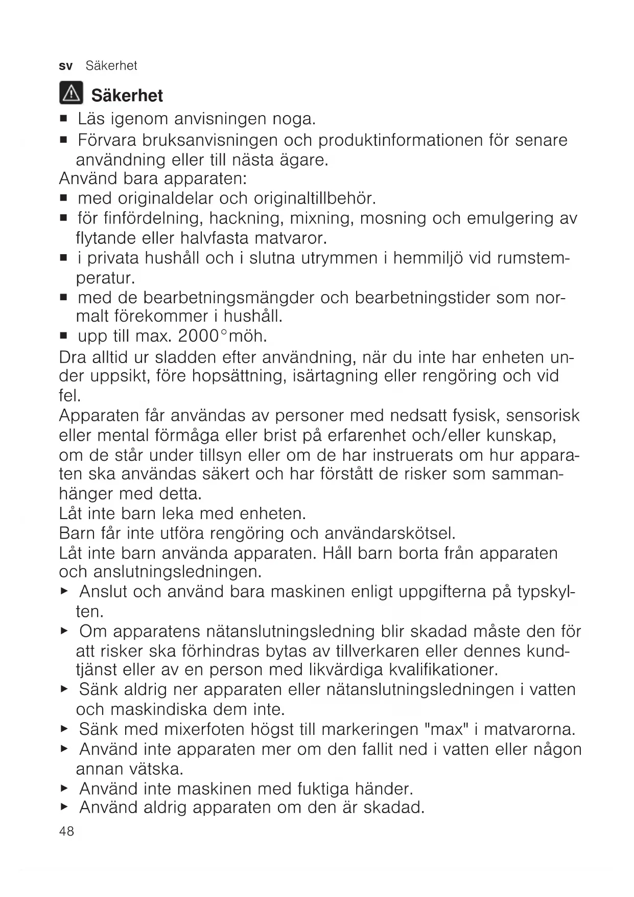 Säkerhet ¡ Läs igenom anvisningen noga. ¡ Förvara bruksanvisningen och produktinformationen för senare användning eller till nästa ägare. Använd bara apparaten: ¡ med originaldelar och originaltillbehör. ¡ för finfördelning, hackning, mixning, mosning och emulgering av flytande eller halvfasta matvaror. ¡ i privata hushåll och i slutna utrymmen i hemmiljö vid rumstem- peratur. ¡ med de bearbetningsmängder och bearbetningstider som nor- malt förekommer i hushåll. ¡ upp till max. 2000°möh. Dra alltid ur sladden efter användning, när du inte har enheten un- der uppsikt, före hopsättning, isärtagning eller rengöring och vid fel. Apparaten får användas av personer med nedsatt fysisk, sensorisk eller mental förmåga eller brist på erfarenhet och/eller kunskap, om de står under tillsyn eller om de har instruerats om hur appara- ten ska användas säkert och har förstått de risker som samman- hänger med detta. Låt inte barn leka med enheten. Barn får inte utföra rengöring och användarskötsel. Låt inte barn använda apparaten. Håll barn borta från apparaten och anslutningsledningen. ▶ Anslut och använd bara maskinen enligt uppgifterna på typskyl- ten. ▶ Om apparatens nätanslutningsledning blir skadad måste den för att risker ska förhindras bytas av tillverkaren eller dennes kund- tjänst eller av en person med likvärdiga kvalifikationer. ▶ Sänk aldrig ner apparaten eller nätanslutningsledningen i vatten och maskindiska dem inte. ▶ Sänk med mixerfoten högst till markeringen "max" i matvarorna. ▶ Använd inte apparaten mer om den fallit ned i vatten eller någon annan vätska. ▶ Använd inte maskinen med fuktiga händer. ▶ Använd aldrig apparaten om den är skadad.Undvika sakskador sv