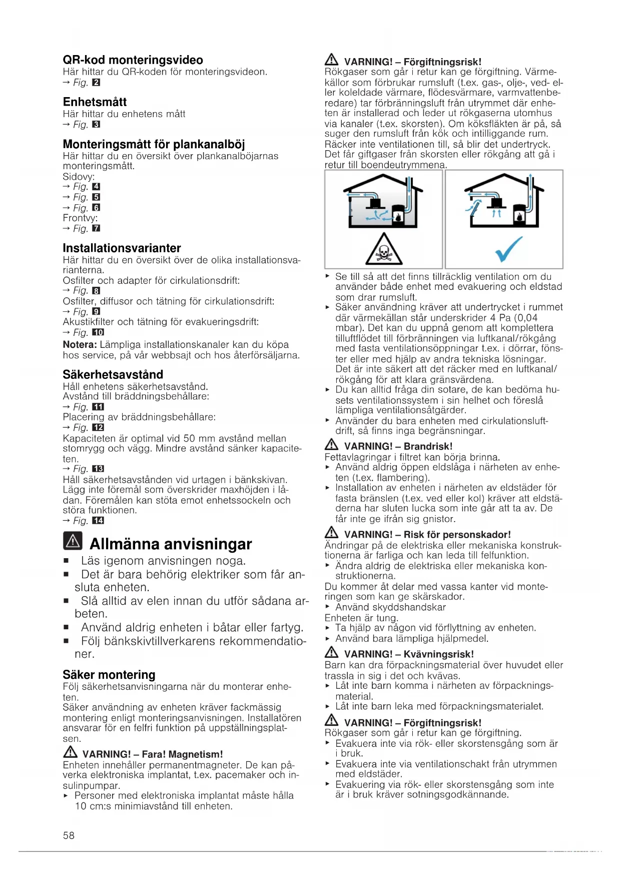 Personer med elektroniska implantat måste hålla 10cm:s minimiavstånd till enheten. VARNING!‒Förgiftningsrisk! Rökgaser som går i retur kan ge förgiftning. Värme- källor som förbrukar rumsluft (t.ex. gas-, olje-, ved- el- ler koleldade värmare, flödesvärmare, varmvattenbe- redare) tar förbränningsluft från utrymmet där enhe- ten är installerad och leder ut rökgaserna utomhus via kanaler (t.ex. skorsten). Om köksfläkten är på, så suger den rumsluft från kök och intilliggande rum. Räcker inte ventilationen till, så blir det undertryck. Det får giftgaser från skorsten eller rökgång att gå i retur till boendeutrymmena.