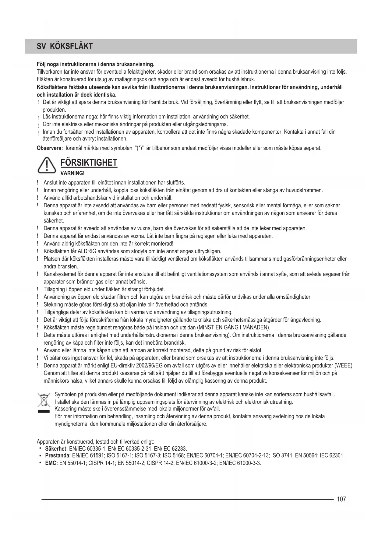 Observera: föremål märkta med symbolen ”(*)” är tillbehör som endast medföljer vissa modeller eller som måste köpas separat. Apparaten är konstruerad, testad och tillverkad enligt: FÖRSIKTIGHET VARNING! Symbolen på produkten eller på medföljande dokument indikerar att denna apparat kanske inte kan sorteras som hushållsavfall. I stället ska den lämnas in på lämplig uppsamlingsplats för återvinning av elektrisk och elektronisk utrustning. Kassering måste ske i överensstämmelse med lokala miljönormer för avfall. För mer information om behandling, insamling och återvinning av denna produkt, kontakta ansvarig avdelning hos de lokala myndigheterna, den kommunala miljöstationen eller din återförsäljare. Säkerhet: EN/IEC 60335-1; EN/IEC 60335-2-31, EN/IEC 62233. Prestanda: EN/IEC 61591; ISO 5167-1; ISO 5167-3; ISO 5168; EN/IEC 60704-1; EN/IEC 60704-2-13; ISO 3741; EN 50564; IEC 62301. EMC: EN 55014-1; CISPR 14-1; EN 55014-2; CISPR 14-2; EN/IEC 61000-3-2; EN/IEC 61000-3-3. ! Anslut inte apparaten till elnätet innan installationen har slutförts. ! Innan rengöring eller underhåll, koppla loss köksfläkten från elnätet genom att dra ut kontakten eller stänga av huvudströmmen. ! Använd alltid arbetshandskar vid installation och underhåll. ! Denna apparat är inte avsedd att användas av barn eller personer med nedsatt fysisk, sensorisk eller mental förmåga, eller som saknar kunskap och erfarenhet, om de inte övervakas eller har fått särskilda instruktioner om användningen av någon som ansvarar för deras säkerhet. ! Denna apparat är avsedd att användas av vuxna, barn ska övervakas för att säkerställa att de inte leker med apparaten. ! Denna apparat får endast användas av vuxna. Låt inte barn fingra på reglagen eller leka med apparaten. ! Använd aldrig köksfläkten om den inte är korrekt monterad! ! Köksfläkten får ALDRIG användas som stödyta om inte annat anges uttryckligen. ! Platsen där köksfläkten installeras måste vara tillräckligt ventilerad om köksfläkten används tillsammans med gasförbränningsenheter eller andra bränslen. ! Kanalsystemet för denna apparat får inte anslutas till ett befintligt ventilationssystem som används i annat syfte, som att avleda avgaser från apparater som bränner gas eller annat bränsle. ! Tillagning i öppen eld under fläkten är strängt förbjudet. ! Användning av öppen eld skadar filtren och kan utgöra en brandrisk och måste därför undvikas under alla omständigheter. ! Stekning måste göras försiktigt så att oljan inte blir överhettad och antänds. ! Tillgängliga delar av köksfläkten kan bli varma vid användning av tillagningsutrustning. ! Det är viktigt att följa föreskrifterna från lokala myndigheter gällande tekniska och säkerhetsmässiga åtgärder för ångavledning. ! Köksfläkten måste regelbundet rengöras både på insidan och utsidan (MINST EN GÅNG I MÅNADEN). ! Detta måste utföras i enlighet med underhållsinstruktionerna i denna bruksanvisning). Om instruktionerna i denna bruksanvisning gällande rengöring av kåpa och filter inte följs, kan det innebära brandrisk. ! Använd eller lämna inte kåpan utan att lampan är korrekt monterad, detta på grund av risk för elstöt. ! Vi påtar oss inget ansvar för fel, skada på apparaten, eller brand som orsakas av att instruktionerna i denna bruksanvisning inte följs. ! Denna apparat är märkt enligt EU-direktiv 2002/96/EG om avfall som utgörs av eller innehåller elektriska eller elektroniska produkter (WEEE). Genom att tillse att denna produkt kasseras på rätt sätt hjälper du till att förebygga eventuella negativa konsekvenser för miljön och på människors hälsa, vilket annars skulle kunna orsakas till följd av olämplig kassering av denna produkt.