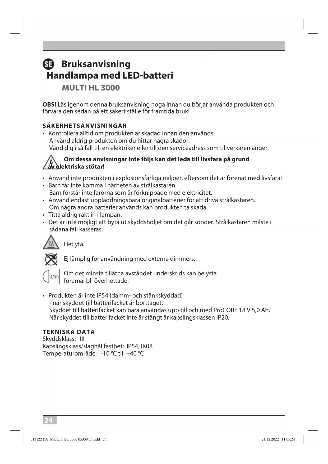 - Produkten är inte IP54 (damm- och stänkskyddad) - när skyddet till batterifacket är borttaget. Skyddet till batterifacket kan bara användas upp till och med ProCORE 18 V 5,0 Ah. När skyddet till batterifacket inte är stängt är kapslingsklassen IP20. TEKNISKA DATA Skyddsklass: III Kapslingsklass/slaghållfasthet: IP54, IK08 Temperaturområde: -10 °C till +40 °C 013122 BA_MULTI HL 3000 0533947.indd 24013122 BA_MULTI HL 3000 0533947.indd 24 21.12.2022 11:05:2421.12.2022 11:05:2425 MULTI HL 3000 Bruksanvisning Typ: MULTI HL 3000 Kompatibla batterityper: Du hittar en översikt över alla tillgängliga adaptrar och matchande batterier på vår hemsida www.brennenstuhl.com Max. projektionsyta: 183,63 cm