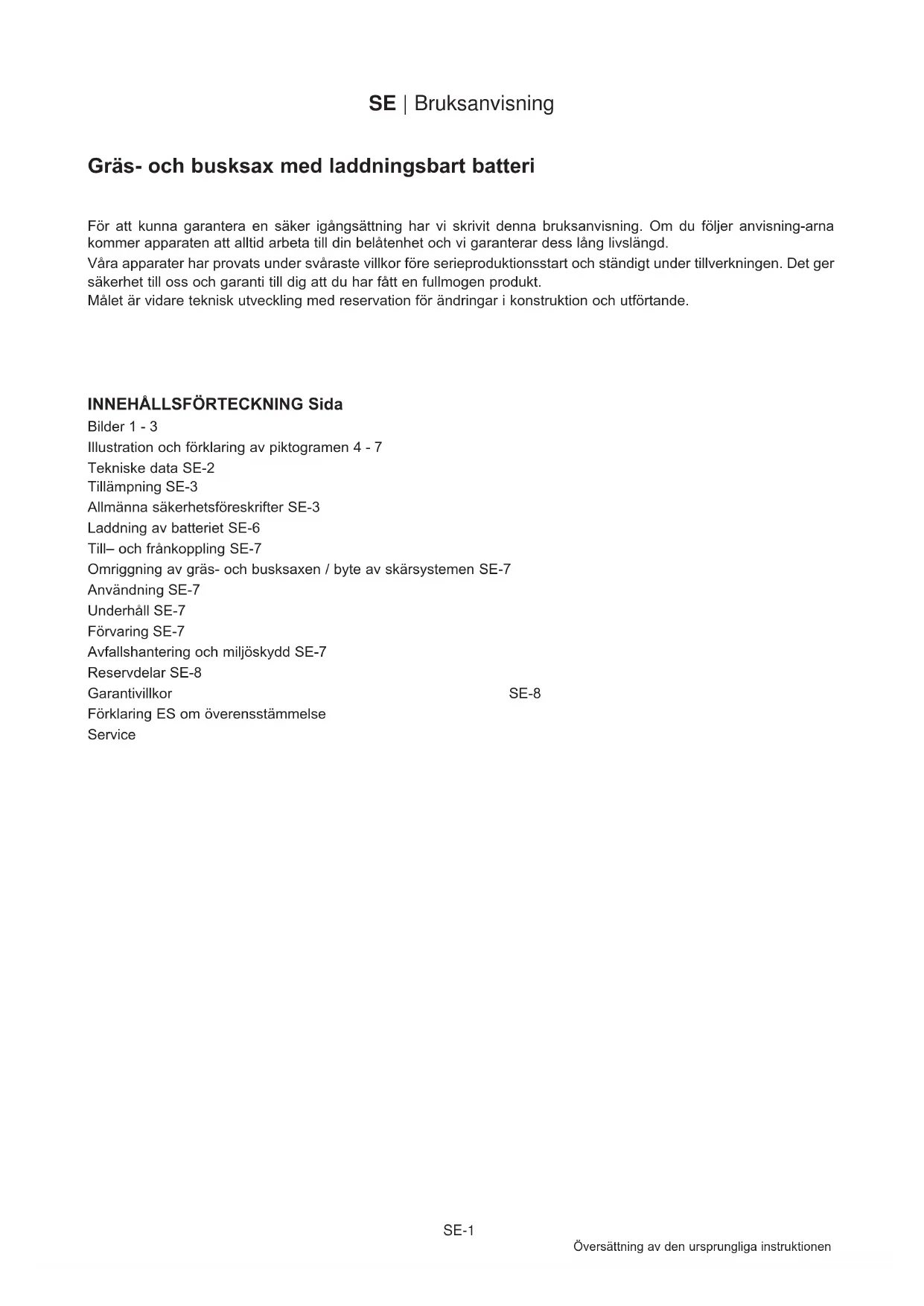 Bruksanvisning - Översättning av den ursprungliga instruktionen Gräs- och busksax med laddningsbart batteri