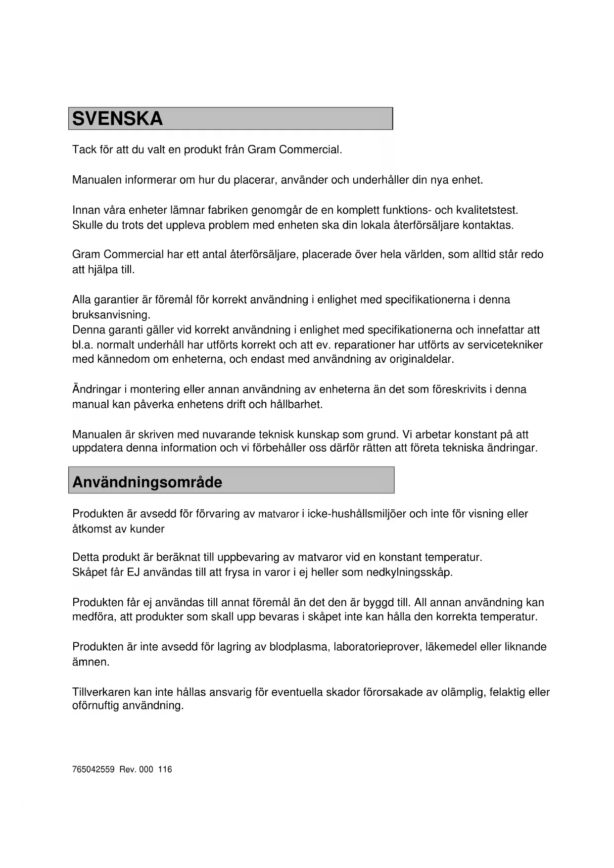 Tack för att du valt en produkt från Gram Commercial. Manualen informerar om hur du placerar, använder och underhåller din nya enhet. Innan våra enheter lämnar fabriken genomgår de en komplett funktions- och kvalitetstest. Skulle du trots det uppleva problem med enheten ska din lokala återförsäljare kontaktas. Gram Commercial har ett antal återförsäljare, placerade över hela världen, som alltid står redo att hjälpa till. Alla garantier är föremål för korrekt användning i enlighet med specifikationerna i denna bruksanvisning. Denna garanti gäller vid korrekt användning i enlighet med specifikationerna och innefattar att bl.a. normalt underhåll har utförts korrekt och att ev. reparationer har utförts av servicetekniker med kännedom om enheterna, och endast med användning av originaldelar. Ändringar i montering eller annan användning av enheterna än det som föreskrivits i denna manual kan påverka enhetens drift och hållbarhet. Manualen är skriven med nuvarande teknisk kunskap som grund. Vi arbetar konstant på att uppdatera denna information och vi förbehåller oss därför rätten att företa tekniska ändringar. Användningsområde