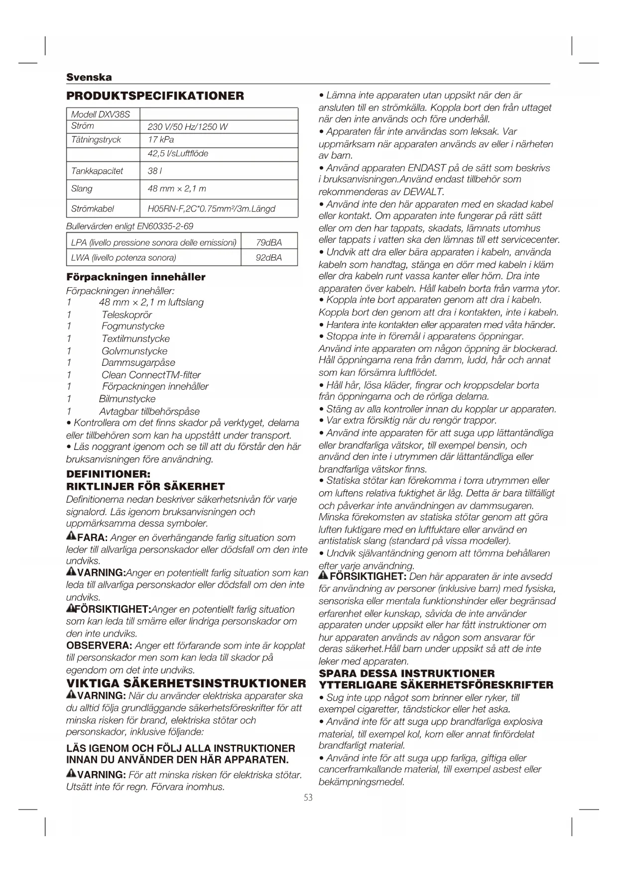 - Undvik självantändning genom att tömma behållaren efter varje användning. LÄS IGENOM OCH FÖLJ ALLA INSTRUKTIONER INNAN DU ANVÄNDER DEN HÄR APPARATEN. Modell DXV38S54 Svenska VARNING! VARNING!