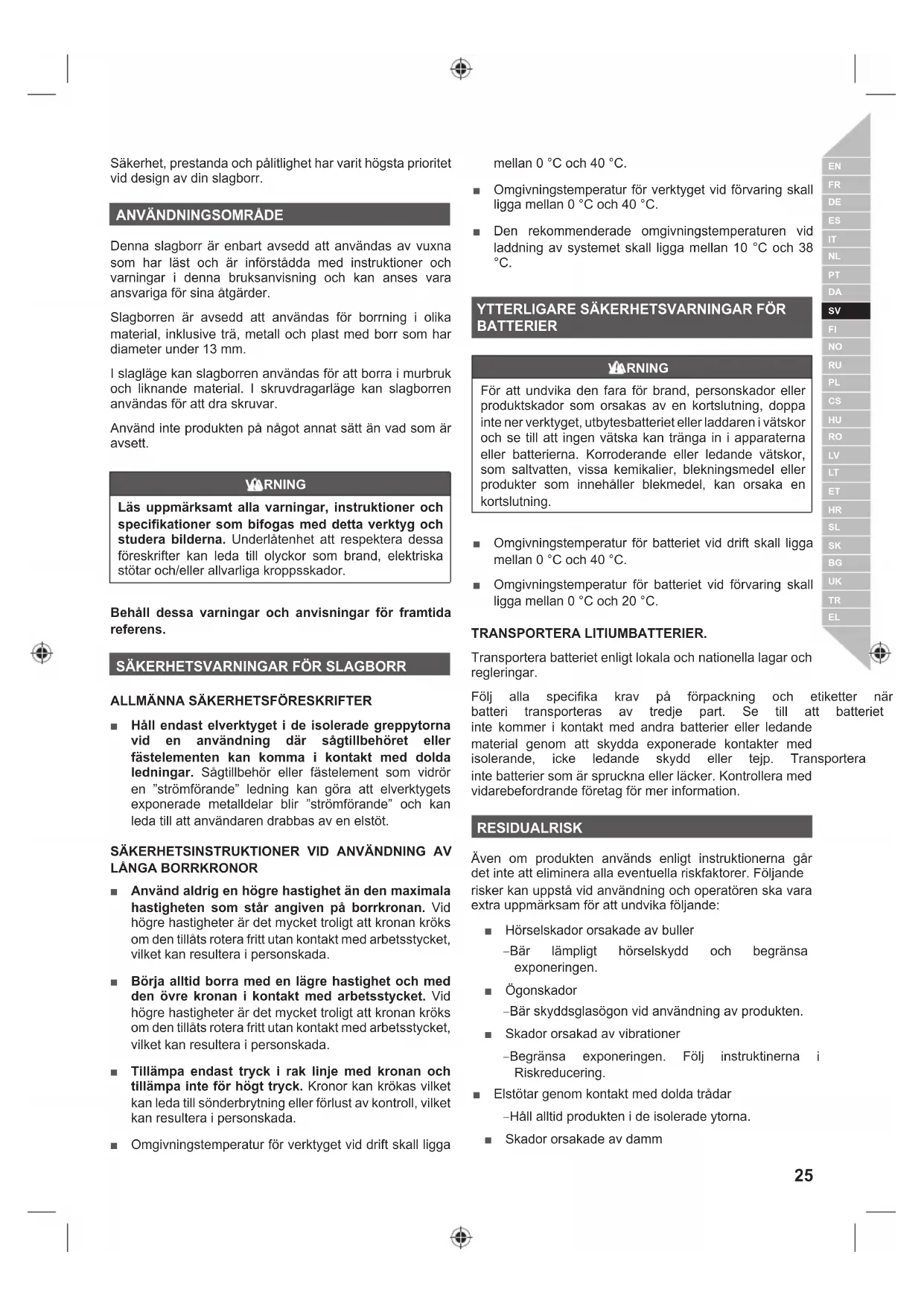 Ŷ Använd aldrig en högre hastighet än den maximala hastigheten som står angiven på borrkronan. Vid högre hastigheter är det mycket troligt att kronan kröks om den tillåts rotera fritt utan kontakt med arbetsstycket, vilket kan resultera i personskada. Ŷ Börja alltid borra med en lägre hastighet och med den övre kronan i kontakt med arbetsstycket. Vid högre hastigheter är det mycket troligt att kronan kröks om den tillåts rotera fritt utan kontakt med arbetsstycket, vilket kan resultera i personskada. Ŷ Tillämpa endast tryck i rak linje med kronan och tillämpa inte för högt tryck. Kronor kan krökas vilket kan leda till sönderbrytning eller förlust av kontroll, vilket kan resultera i personskada. Ŷ Omgivningstemperatur för verktyget vid drift skall ligga mellan 0 °C och 40 °C. Ŷ Omgivningstemperatur för verktyget vid förvaring skall ligga mellan 0 °C och 40 °C. Ŷ Den rekommenderade omgivningstemperaturen vid laddning av systemet skall ligga mellan 10 °C och 38 °C.