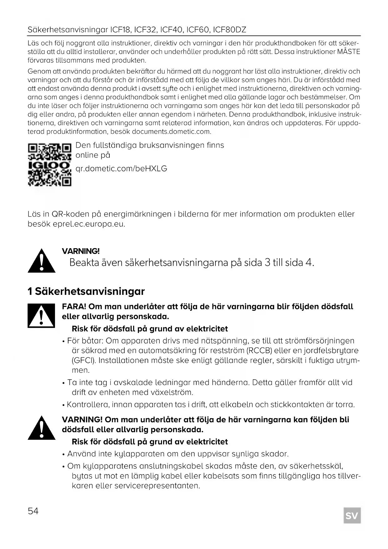 - Om kylapparatens anslutningskabel skadas måste den, av säkerhetsskäl, bytas ut mot en lämplig kabel eller kabelsats som finns tillgängliga hos tillver- karen eller servicerepresentanten. Den fullständiga bruksanvisningen finns online på qr.dometic.com/beHXLG Igloo ICF18, ICF32, ICF40, ICF60, ICF80DZ_ SOM_4445103836_ EMEA24-ar _202x-xx-xx.book Page 54 Friday, September 15, 2023 12:50 PMICF18, ICF32, ICF40, ICF60, ICF80DZ Säkerhetsanvisningar