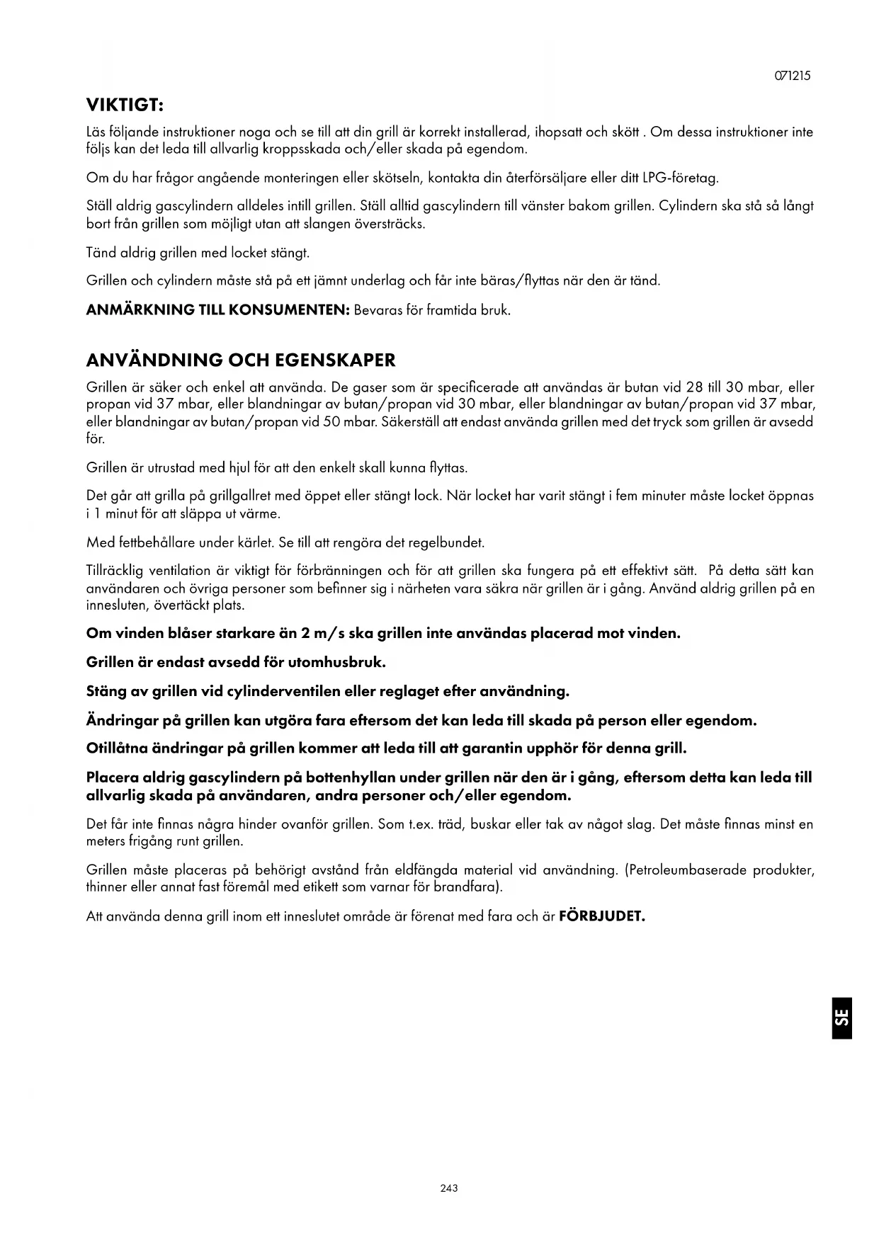 Grillen är säker och enkel att använda. De gaser som är specificerade att användas är butan vid 28 till 30 mbar, eller propan vid 37 mbar, eller blandningar av butan/propan vid 30 mbar, eller blandningar av butan/propan vid 37 mbar, eller blandningar av butan/propan vid 50 mbar. Säkerställ att endast använda grillen med det tryck som grillen är avsedd för. Grillen är utrustad med hjul för att den enkelt skall kunna flyttas. Det går att grilla på grillgallret med öppet eller stängt lock. När locket har varit stängt i fem minuter måste locket öppnas i 1 minut för att släppa ut värme. Med fettbehållare under kärlet. Se till att rengöra det regelbundet. Tillräcklig ventilation är viktigt för förbränningen och för att grillen ska fungera på ett effektivt sätt. På detta sätt kan användaren och övriga personer som befinner sig i närheten vara säkra när grillen är i gång. Använd aldrig grillen på en innesluten, övertäckt plats. Om vinden blåser starkare än 2 m/s ska grillen inte användas placerad mot vinden. Grillen är endast avsedd för utomhusbruk. Stäng av grillen vid cylinderventilen eller reglaget efter användning. Ändringar på grillen kan utgöra fara eftersom det kan leda till skada på person eller egendom. Otillåtna ändringar på grillen kommer att leda till att garantin upphör för denna grill. Placera aldrig gascylindern på bottenhyllan under grillen när den är i gång, eftersom detta kan leda till allvarlig skada på användaren, andra personer och/eller egendom. Det får inte finnas några hinder ovanför grillen. Som t.ex. träd, buskar eller tak av något slag. Det måste finnas minst en meters frigång runt grillen. Grillen måste placeras på behörigt avstånd från eldfängda material vid användning. (Petroleumbaserade produkter, thinner eller annat fast föremål med etikett som varnar för brandfara). Att använda denna grill inom ett inneslutet område är förenat med fara och är FÖRBJUDET. SE244