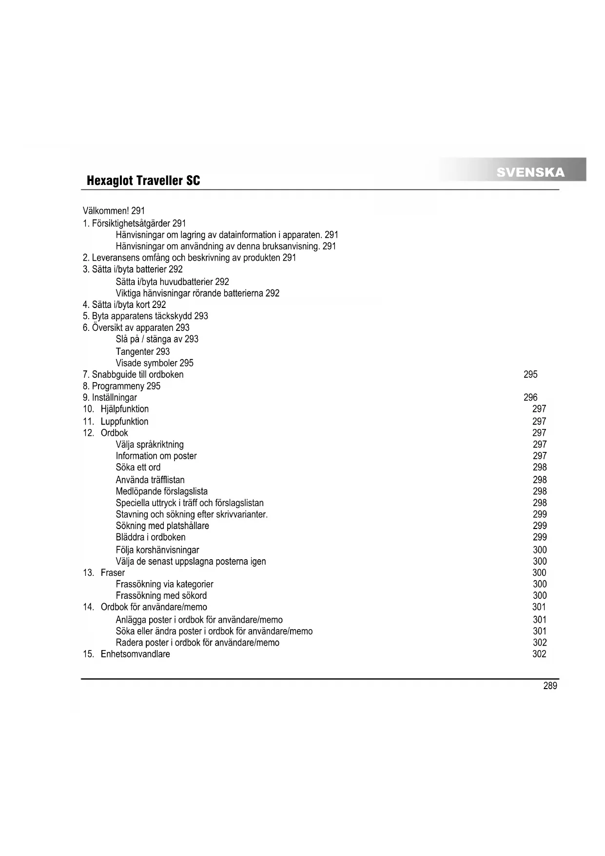 SVENSKA Välkommen! Tack för att du valt att köpa vår produkt Hexaglot Traveller SC. Var god tag ett par minuter för att noggrant läsa bruksanvisningen i sin helhet före första användning, så kommer du att kunna utnyttja apparatens samtliga funktioner och glädja dig åt din översättare i många år. Förvara denna bruksanvisning säkert så att den är till hands för framtida bruk. Hexaglot önskar dig mycket nöje med din Hexaglot Traveller SC!