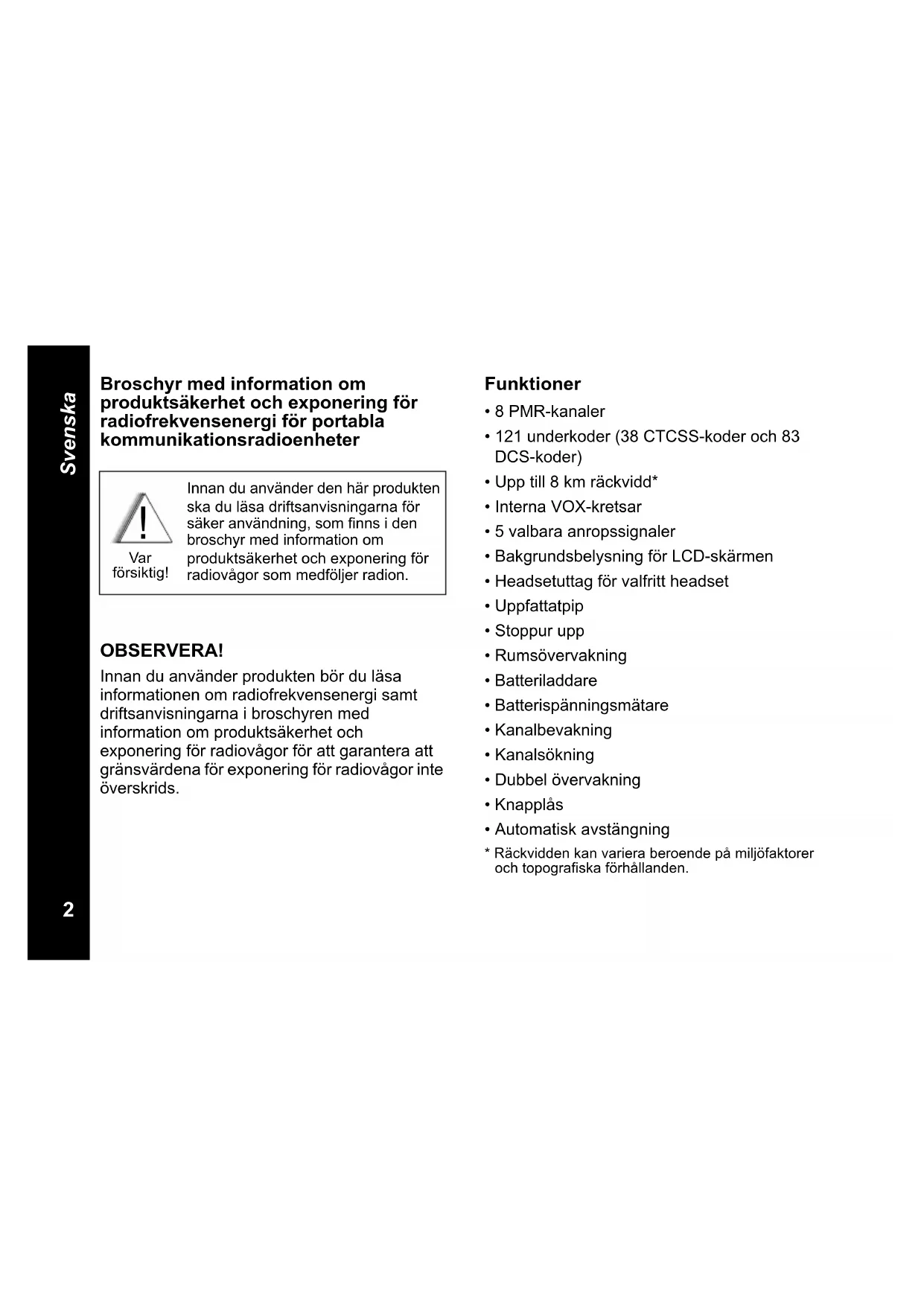 - Räckvidden kan variera beroende på miljöfaktorer och topografiska förhållanden. Innan du använder den här produkten ska du läsa driftsanvisningarna för säker användning, som finns i den broschyr med information om produktsäkerhet och exponering för radiovågor som medföljer radion.