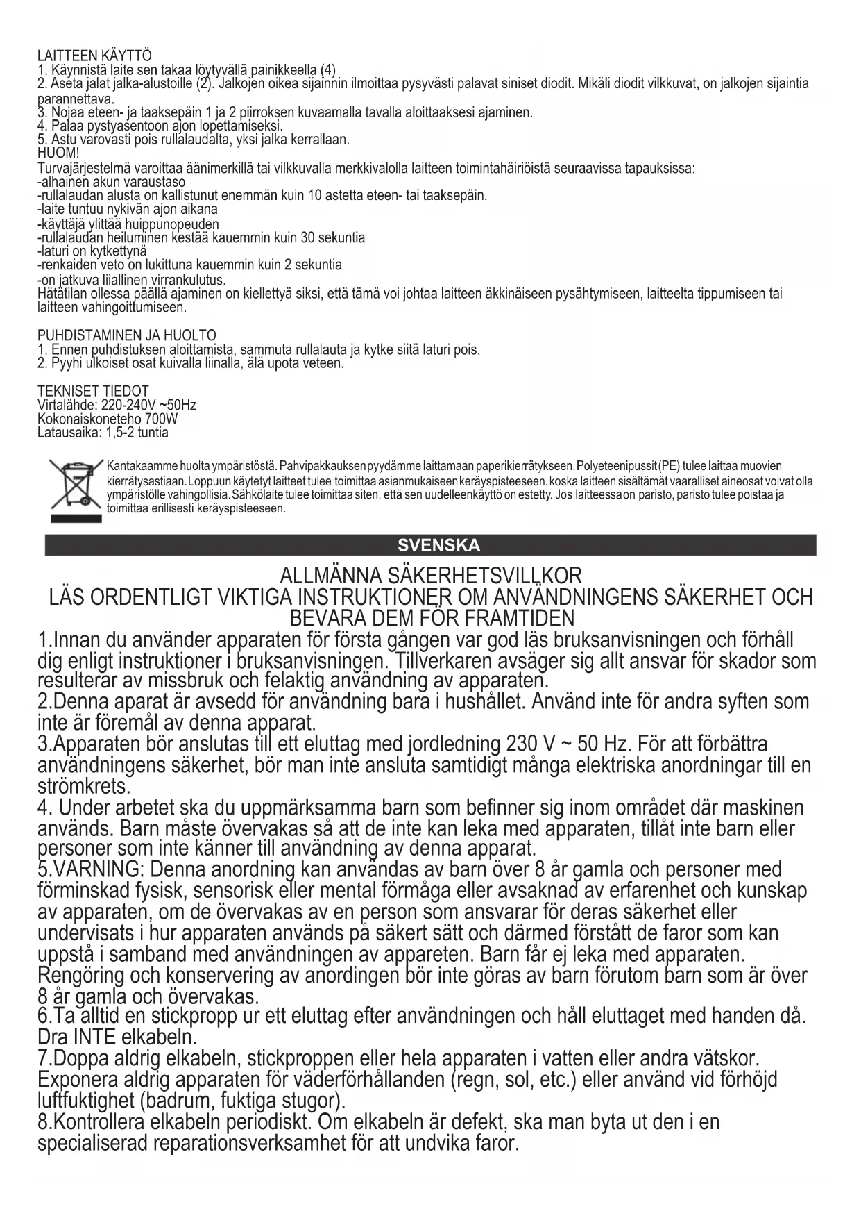 1.Innan du använder apparaten för första gången var god läs bruksanvisningen och förhåll dig enligt instruktioner i bruksanvisningen. Tillverkaren avsäger sig allt ansvar för skador som resulterar av missbruk och felaktig användning av apparaten. 2.Denna aparat är avsedd för användning bara i hushållet. Använd inte för andra syften som inte är föremål av denna apparat. 3.Apparaten bör anslutas till ett eluttag med jordledning 230 V ~ 50 Hz. För att förbättra användningens säkerhet, bör man inte ansluta samtidigt många elektriska anordningar till en strömkrets.