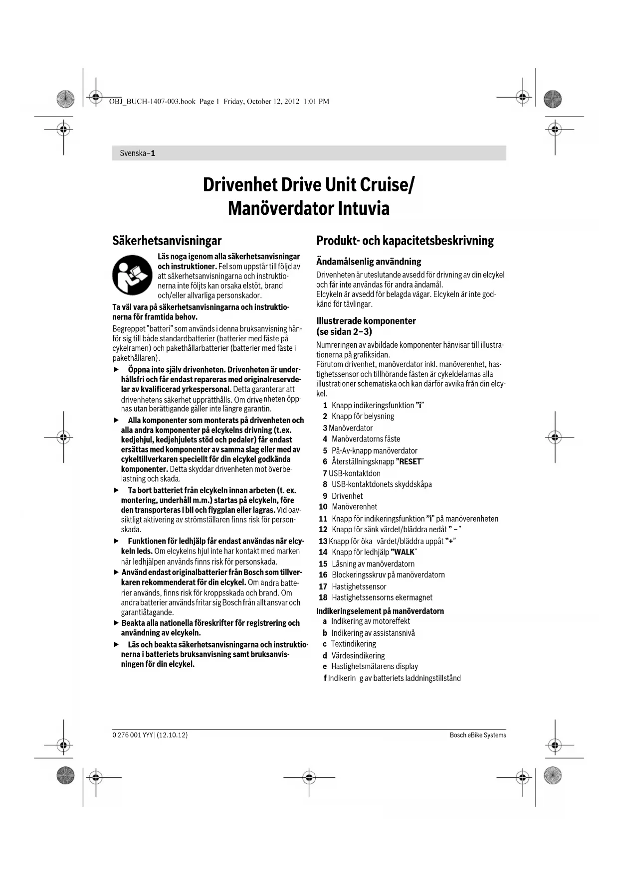 3 Manöverdator 4 Manöverdatorns fäste 5 På-Av-knapp manöverdator 6 Återställningsknapp ”RESET” 7 USB-kontaktdon 8 USB-kontaktdonets skyddskåpa 9 Drivenhet 10 Manöverenhet 11 Knapp för indikeringsfunktion ”i” på manöverenheten 12 Knapp för sänk värdet/bläddra nedåt ” –” 13 Knapp för öka värdet/bläddra uppåt ”+” 14 Knapp för ledhjälp ”WALK” 15 Låsning av manöverdatorn 16 Blockeringsskruv på manöverdatorn 17 Hastighetssensor 18 Hastighetssensorns ekermagnet Indikeringselement på manöverdatorn a Indikering av motoreffekt b Indikering av assistansnivå c Textindikering d Värdesindikering e Hastighetsmätarens display f Indikerin g av batteriets laddningstillstånd OBJ_BUCH-1407-003.book Page 1 Friday, October 12, 2012 1:01 PMSvenska–2 Bosch eBike Systems 0 276 001 YYY | (12.10.12) Tekniska data Montage Insättning och uttagning av batteriet För insättning av batteriet på elcykeln och för borttagning se batteriets bruksanvisning. Insättning och borttagning av manöverdatorn (se bild A) För insättning av manöverdatorn 3 skjut framifrån in den i fästet 4. För borttagning av manöverdatorn 3 tryck på spärren 15 och skjut ut den framåt ur fästet 4. Ta bort manöverdatorn från parkerad elcykel för att obefogad person inte ska kunna använda drivenheten. Utan manöverdator kan elcykelsystemet inte kopplas på. Det är även möjligt att som skydd mot stöld låsa manöverda- torn i fästet. Demontera fästet 4 från styret. Placera manöver- datorn i fästet. Skruva in blockeringsskr uven 16 underifrån i avsedd gänga på fästet. Återmontera fästet på styret. Kontroll av hastighetssensorn (se bild B) Hastighetssensorn 17 och tillhörande ekermagnet 18 måste monteras så att ekermagneten vid ett hjulvarv passerar has- tighetssensorn på ett avstånd om minst 5 mm och högst 17 mm. Anvisning: Om avståndet mellan hastighetssensorn 17 och ekermagneten 18 är för litet eller för stort eller är hastighets- sensorn 17 inte korrekt anslute n, fungerar inte indikeringen på hastighetsmätaren e och elcykelns drivenhet fungerar i nödkörningsprogram. Lossa i detta fall ekermagnetens 18 skruv och fäst ekermag- neten så att den på korrekt avstånd passerar markeringen på hastighetssensorn. Om hastighetsmätaren e fortfarande sak- nar indikering, kontakta en auktoriserad cykelhandlare. Drift Driftstart Förutsättningar Elcykel-systemet kan aktiveras endast under följande förut- sättningar: –Ett fulladdat batteri har satts in (se batteriets bruksanvis- ning). – Manöverdatorn sitter korrekt i fästet (se ”Insättning och borttagning av manöverdatorn”, sida Svenska–2). –Hastighetssensorn är korrekt ansluten (se ”Kontroll av has- tighetssensorn”, sida Svenska–2). In-/urkoppling av elcykelsystemet För inkoppling av elcykelsystemet finns följande alternativ. – Om manöverdatorn redan är påkopplad när den placeras i fästet slås elcykelsystemet automatiskt på. –Tryck vid insatt manöverdator och insatt batteri helt kort på manöverdatorns På-Av-knapp 5. –Tryck vid insatt manöverdator batteriets På-Av-knapp (se batteriets bruksanvisning). Anvisning: Elcykelns pedaler får inte belastas när elcykelsys- temet kopplas på, i annat fall begränsas motoreffekten. I text- indikeringen c visas felmeddelandet ”Release pedal” (avlasta pedalen). Om elcykelsystemet oavsiktligt påkopplats med belastade pedaler, koppla i detta fall från och åter på utan belastning. Drivenheten aktiveras så fort du trampar pedalerna (förutom vid ledhjälpsfunktionen, se ”In-/urkoppling av ledhjälp”, sida Svenska–3). Motoreffekten är relaterad till inställningarna på manöverdatorn. Så fort du slutat trampa pedalerna i normaldrift eller en h as- tighet på 25 km/h uppnåtts, frånkopplar elcykeldriften assis- tansen. Drivningen aktiveras åter automatiskt när pedalerna trampas och en hastighet på 25 km/h underskrids. Drivenhet Drive Unit Cruise Produktnummer 0 275 007 006/