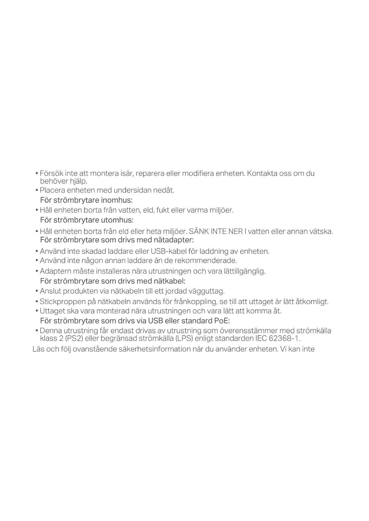 - Denna utrustning får endast drivas av utrustning som överensstämmer med strömkälla klass 2 (PS2) eller begränsad strömkälla (LPS) enligt standarden IEC 62368-1. Läs och följ ovanstående säkerhetsinformation när du använder enheten. Vi kan integarantera att inga olyckor eller skador kan inträffa till följd av felaktig användning av produkten. Använd den här produkten med omsorg och på eget ansvar. TP-Link begränsad produktgaranti Enbart för produkter av märket TP-Link. För information om garantitid, policy och förfaranden, gå till https://www.tp-link.com/en/support DEN HÄR GARANTIN GER DIG SPECIFIKA FORMELLA RÄTTIGHETER OCH DU KAN HA ANDRA RÄTTIGHETER SOM VARIERAR FRÅN LAND TILL LAND (ELLER STAT ELLER PROVINS). I DEN OMFATTNING SOM LOKALA LAGAR TILLÅTER ÄR DENNA GARANTI OCH GOTTGÖRANDEN EXKLUSIVA OCH I STÄLLET FÖR ALLA ANDRA GARANTIER, GOTTGÖRANDEN OCH VILLKOR. TP-Link garanterar maskinvara av märket TP-Link i sin originalförpackning mot defekter i material eller sammansättning vid normal användning enligt TP-Links riktlinjer och under en period beroende på lokal underhållsservice baserat från ursprungliga inköpsdatumet för slutanvändaren. Norsk Sikkerhetsinformasjon