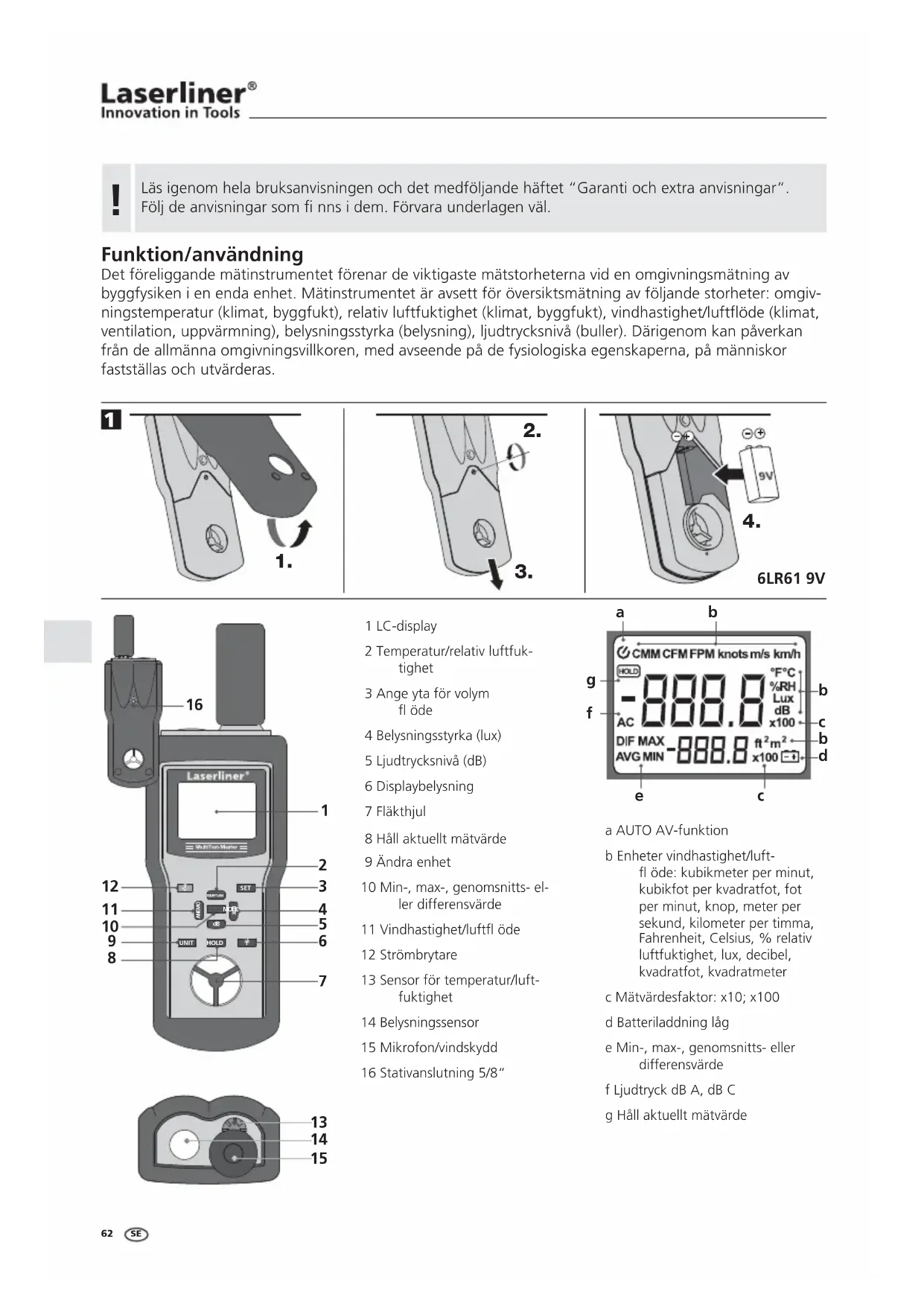 1 LC-display 2 Temperatur/relativ luftfuk- tighet 3 Ange yta för volym × öde 4 Belysningsstyrka (lux) 5 Ljudtrycksnivå (dB) 6 Displaybelysning 7 Fläkthjul 8 Håll aktuellt mätvärde 9 Ändra enhet 10 Min-, max-, genomsnitts- el- ler differensvärde 11 Vindhastighet/luft× öde 12 Strömbrytare 13 Sensor för temperatur/luft- fuktighet 14 Belysningssensor 15 Mikrofon/vindskydd 16 Stativanslutning 5/8“ a AUTO AV-funktion b Enheter vindhastighet/luft- × öde: kubikmeter per minut, kubikfot per kvadratfot, fot per minut, knop, meter per sekund, kilometer per timma, Fahrenheit, Celsius, % relativ luftfuktighet, lux, decibel, kvadratfot, kvadratmeter c Mätvärdesfaktor: x10; x100 d Batteriladdning låg e Min-, max-, genomsnitts- eller differensvärde f Ljudtryck dB A, dB C g Håll aktuellt mätvärde