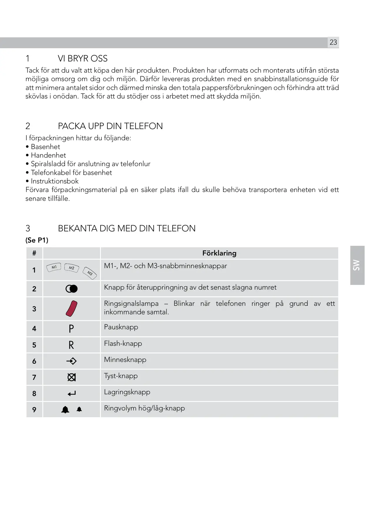 I förpackningen hittar du följande: tBasenhet tHandenhet tSpiralsladd för anslutning av telefonlur tTelefonkabel för basenhet tInstruktionsbok Förvara förpackningsmaterial på en säker plats ifall du skulle behöva transportera enheten vid ett senare tillfälle.