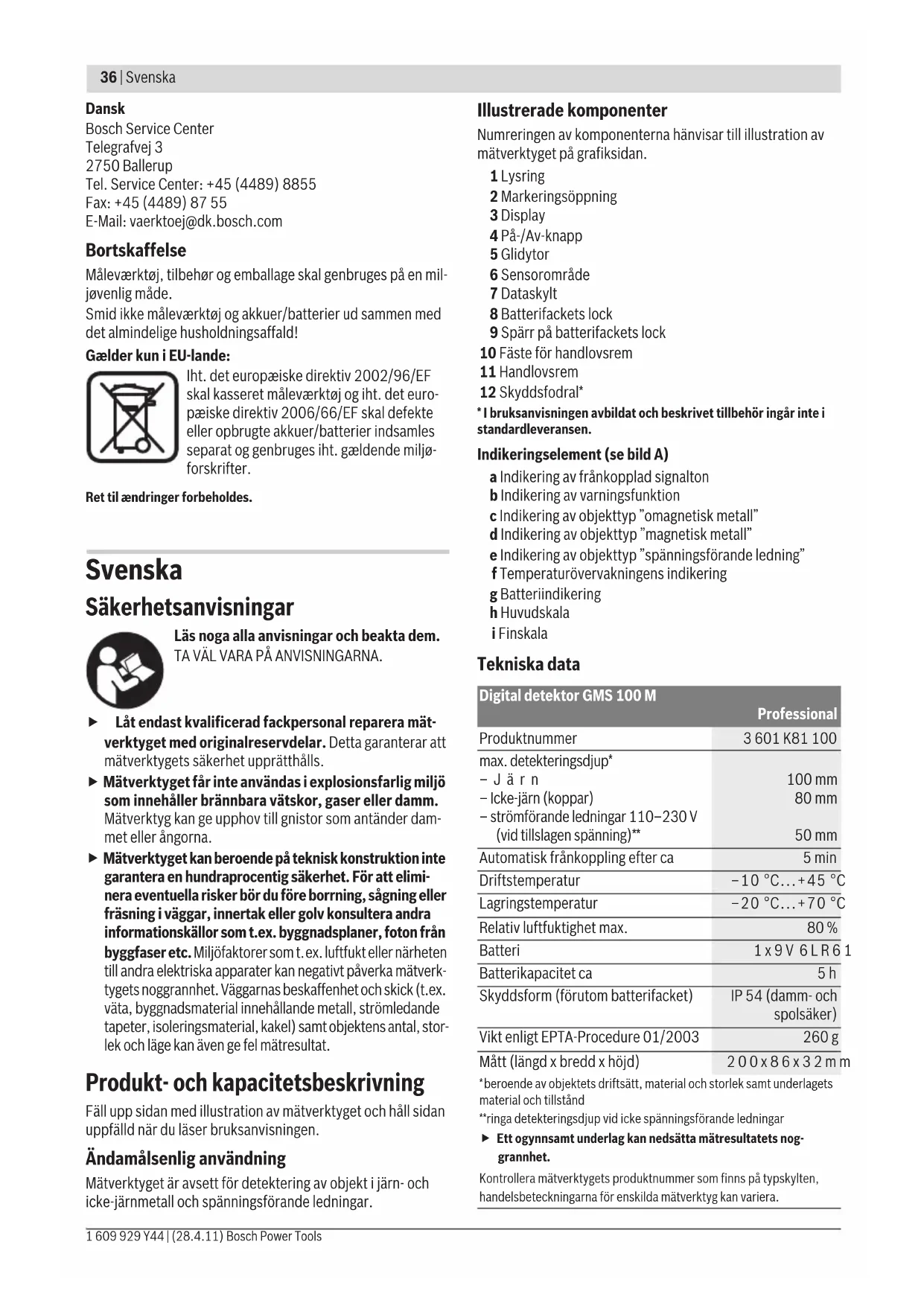 - I bruksanvisningen avbildat och beskrivet tillbehör ingår inte i standardleveransen. Indikeringselement (se bild A) a Indikering av frånkopplad signalton b Indikering av varningsfunktion c Indikering av objekttyp ”omagnetisk metall” d Indikering av objekttyp ”magnetisk metall” e Indikering av objekttyp ”spänningsförande ledning” f Temperaturövervakningens indikering g Batteriindikering h Huvudskala i Finskala Tekniska data Digital detektor GMS 100 M Professional Produktnummer 3 601 K81 100 max. detekteringsdjup* –Järn – Icke-järn (koppar) – strömförande ledningar 110–230 V (vid tillslagen spänning)** 100 mm 80 mm 50 mm Automatisk frånkoppling efter ca 5min Driftstemperatur –10 °C...+45 °C Lagringstemperatur –20 °C...+70 °C Relativ luftfuktighet max. 80 % Batteri 1x9V 6LR61 Batterikapacitet ca