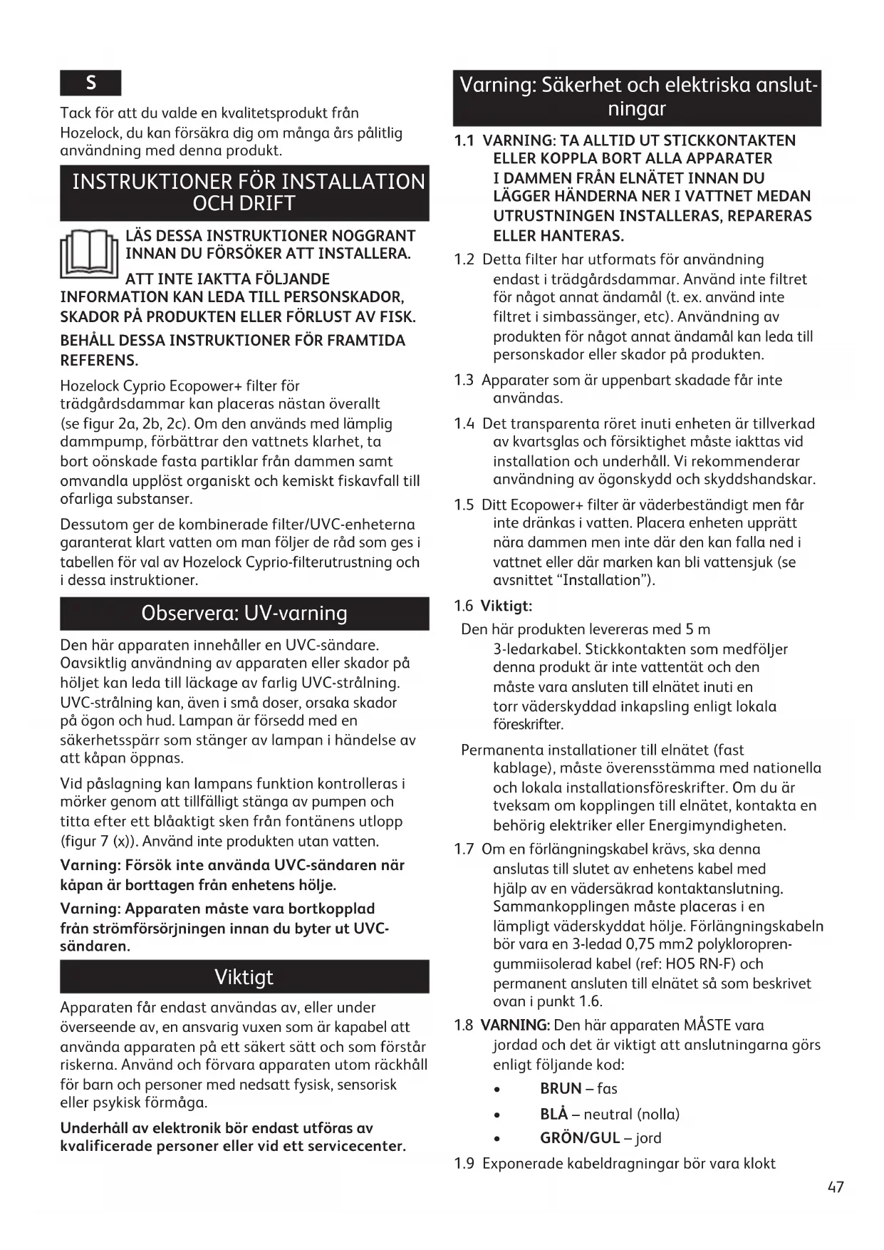 1.2 Detta filter har utformats för användning endast i trädgårdsdammar. Använd inte filtret för något annat ändamål (t. ex. använd inte filtret i simbassänger, etc). Användning av produkten för något annat ändamål kan leda till personskador eller skador på produkten.