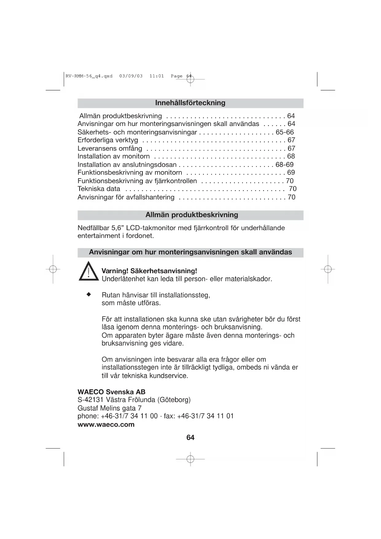 Monteringsplatsen måste vara skyddad mot fukt. På grund av kompakt konstruktion är det lämpligt att montera under instrumentbrädan. Dosan kan sättas fast med de medföljande plåtskruvarna eller med självhäftande kardborreband (medföljer ej). Beakta de Allmänna monteringsanvisningarna! Strömförsörjningen bör ske via en ansluten strömkälla t ex kl. 15. Systemet har även i avstängt tillstånd (IR-mottagning aktiv) en viss strömförbrukning som kan ladda ur fordonets batteri efter en längre tid. RV-RMM-56_q4.qxd 03/09/03 11:01 Page 686969 Funktionsbeskrivning av monitorn Anslutningsdosan har ingångar för 2 videokällor. (se H 3) Det kan vara en DVD-spelare (WAECO Art. Nr. DVD-PL-10), en kamera etc. Anslut videokällans RCA-kabel till VIDEO/AUDIO. Anslutningsdosan ger en monosignal. POWER-knappen (se E 1) Apparaten kopplas på. Allt efter vad som blivit anslutet (t ex WAECO DVD-Spieler, DVD-PL-10) och i drift, visas en bild på motsvarande kanal. Ställ in bilden efter dina behov. Följande funktioner står till förfogande: Knappar ADJ (se E 5) Höja ljudstyrkan vid normaldrift Knappen MENY (se E 3) Funktion meny (se G 1) Input -> Val av videokälla AV 1 eller AV 2 Blue back -> Finns ingen videosignal visas en blå bakgrund, På/av Rotera -> bilden roteras till 180° System -> Val av videoformat PAL/ NTSC Meny Picture (se G 2) Kontrast -> Ställa in kontrastintensitet Klart -> Ställa in ljusstyrka Färg -> Färgintensitet Nyans -> Färgförhållande röd/blå (bara vid NTSC-videoformat) Knappar SEL (se E 4) Till urval av menypunkter Knappar ADJ (se E 5) Inställningar inom menypunkterna RV-RMM-56_q4.qxd 03/09/03 11:01 Page 6970 Funktionsbeskrivning av fjärrkontrollen APC (se F 1) Urval av bildinställningar – Dynamic -> högt kontrastvärde – Normal -> medelhögt kontrastvärde och kontrast – Mild -> lågt kontrastvärde – User -> använder inställningarna från Meny Picture PIC (se F 3) Ropar upp Meny Picture. För alla övriga knappar på fjärrkontrollen se avsnitt Monitor. Display: 5,6 “ Driftspänning: 12 - 15 V Effektförbrukning: max 6 Watt Upplösning: 225 000 pixel Bildformat: 4 : 3 Videoformat: NTSC / PAL Driftstemperatur: 0°-60°C Vikt: ca 1,0 kg Mått b/h/d: 190 x 222 x 34,5 mm Tekniska data Anvisningar för avfallshantering Observera att elektriska apparater innehåller många olika återanvändbara material samt miljöfarliga komponenter. Se för din egen och miljöns skull till att dessa komponenter endast avfallshanteras på föreskrivet och godkänt sätt. RV-RMM-56_q4.qxd 03/09/03 11:01 Page 7071 RV-RMM-56_q4.qxd 03/09/03 11:01 Page 717272 Merknader til bruk av installasjonsveiledningen Innholdsfortegnelse Advarsel! Sikkerhetsanvisninger! Manglende overholdelse kan føre til personskader eller materielle skader. Rutesymbolet angir installasjonsprosedyrer som må følges. Les denne installasjonsveiledning og bruksanvisning før du begynner på monteringen, for en problemfri installasjon. Hvis apparatet skifter eier, skal installasjons- og bruksanvisningen følge med. Hvis bruksanvisningen ikke skulle besvare alle spørsmålene dine, eller noen monteringstrinn være uklare, er du velkommen til å ta kontakt med vår tekniske kundeservice. WAECO Norge AS N-3208 Sandefjord · Leif Weldingsvej 16 phone: +47-33 42 84 50 fax: +47-33 42 84 59 www.waeco.com