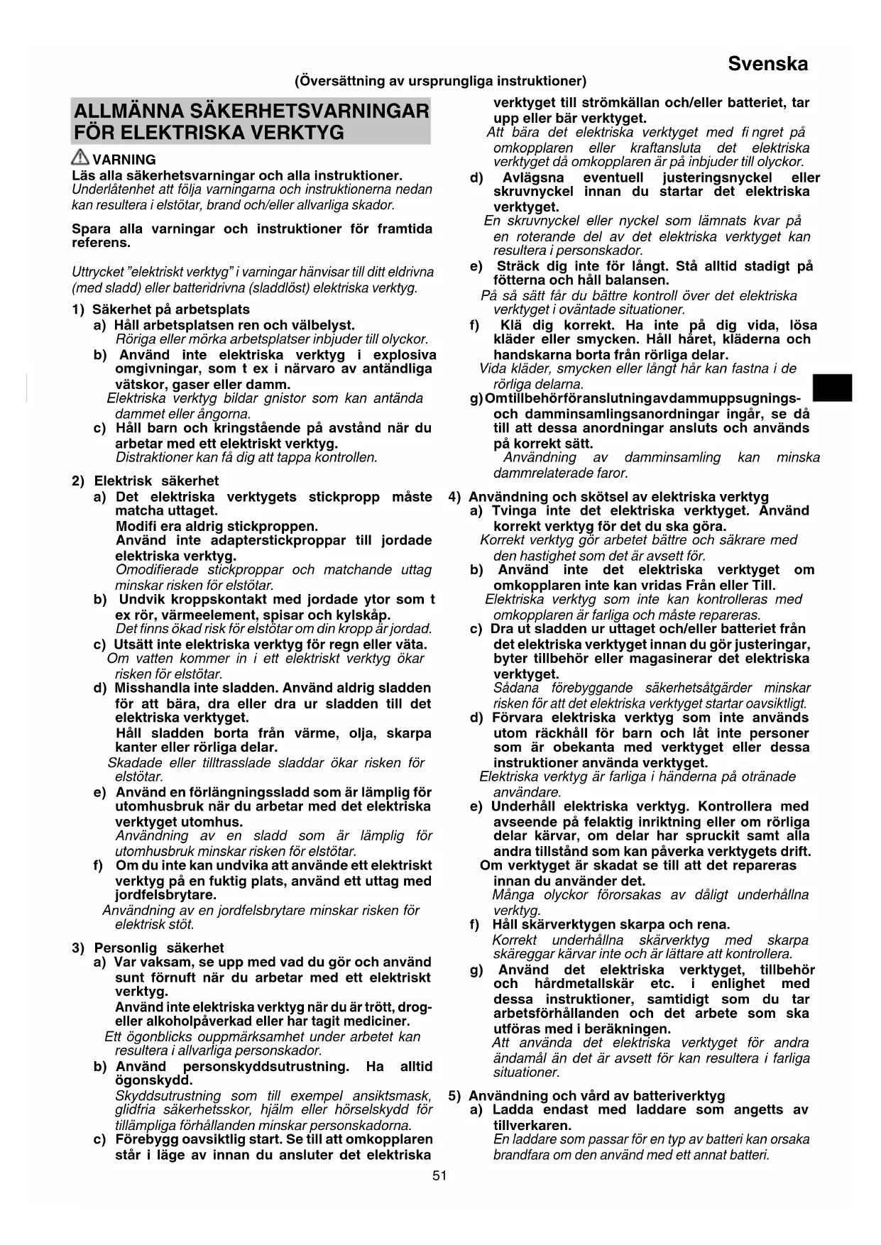 VARNING Läs alla säkerhetsvarningar och alla instruktioner. Underlåtenhet att följa varningarna och instruktionerna nedan kan resultera i elstötar, brand och/eller allvarliga skador. Spara alla varningar och instruktioner för framtida referens. Uttrycket ”elektriskt verktyg” i varningar hänvisar till ditt eldrivna (med sladd) eller batteridrivna (sladdlöst) elektriska verktyg.