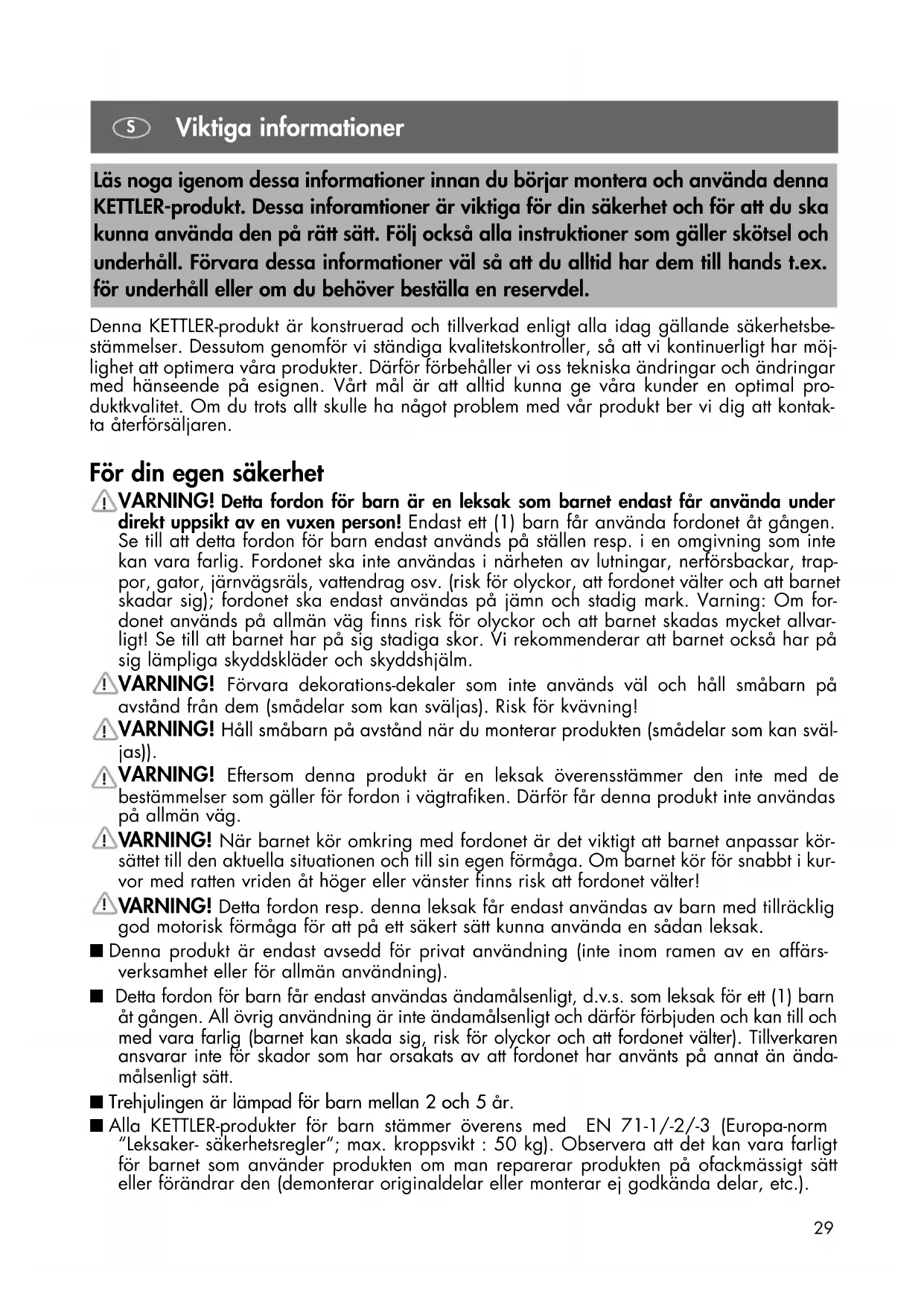 DK29 Viktiga informationer Denna KETTLER-produkt är konstruerad och tillverkad enligt alla idag gällande säkerhetsbe- stämmelser. Dessutom genomför vi ständiga kvalitetskontroller, så att vi kontinuerligt har möj- lighet att optimera våra produkter. Därför förbehåller vi oss tekniska ändringar och ändringar med hänseende på esignen. Vårt mål är att alltid kunna ge våra kunder en optimal pro- duktkvalitet. Om du trots allt skulle ha något problem med vår produkt ber vi dig att kontak- ta återförsäljaren. För din egen säkerhet VARNING! Detta fordon för barn är en leksak som barnet endast får använda under direkt uppsikt av en vuxen person! Endast ett (1) barn får använda fordonet åt gången. Se till att detta fordon för barn endast används på ställen resp. i en omgivning som inte kan vara farlig. Fordonet ska inte användas i närheten av lutningar, nerförsbackar, trap- por, gator, järnvägsräls, vattendrag osv. (risk för olyckor, att fordonet välter och att barnet skadar sig); fordonet ska endast användas på jämn och stadig mark. Varning: Om for- donet används på allmän väg finns risk för olyckor och att barnet skadas mycket allvar- ligt! Se till att barnet har på sig stadiga skor. Vi rekommenderar att barnet också har på sig lämpliga skyddskläder och skyddshjälm. VARNING! Förvara dekorations-dekaler som inte används väl och håll småbarn på avstånd från dem (smådelar som kan sväljas). Risk för kvävning! VARNING! Håll småbarn på avstånd när du monterar produkten (smådelar som kan sväl- jas)). VARNING! Eftersom denna produkt är en leksak överensstämmer den inte med de bestämmelser som gäller för fordon i vägtrafiken. Därför får denna produkt inte användas på allmän väg. VARNING! När barnet kör omkring med fordonet är det viktigt att barnet anpassar kör- sättet till den aktuella situationen och till sin egen förmåga. Om barnet kör för snabbt i kur- vor med ratten vriden åt höger eller vänster finns risk att fordonet välter! VARNING! Detta fordon resp. denna leksak får endast användas av barn med tillräcklig god motorisk förmåga för att på ett säkert sätt kunna använda en sådan leksak. ■ Denna produkt är endast avsedd för privat användning (inte inom ramen av en affärs- verksamhet eller för allmän användning). ■ Detta fordon för barn får endast användas ändamålsenligt, d.v.s. som leksak för ett (1) barn åt gången. All övrig användning är inte ändamålsenligt och därför förbjuden och kan till och med vara farlig (barnet kan skada sig, risk för olyckor och att fordonet välter). Tillverkaren ansvarar inte för skador som har orsakats av att fordonet har använts på annat än ända- målsenligt sätt. ■ Trehjulingen är lämpad för barn mellan 2 och 5 år. ■ Alla KETTLER-produkter för barn stämmer överens med EN 71-1/-2/-3 (Europa-norm “Leksaker- säkerhetsregler“; max. kroppsvikt : 50 kg). Observera att det kan vara farligt för barnet som använder produkten om man reparerar produkten på ofackmässigt sätt eller förändrar den (demonterar originaldelar eller monterar ej godkända delar, etc.). Läs noga igenom dessa informationer innan du börjar montera och använda denna KETTLER-produkt. Dessa inforamtioner är viktiga för din säkerhet och för att du ska kunna använda den på rätt sätt. Följ också alla instruktioner som gäller skötsel och underhåll. Förvara dessa informationer väl så att du alltid har dem till hands t.ex. för underhåll eller om du behöver beställa en reservdel.