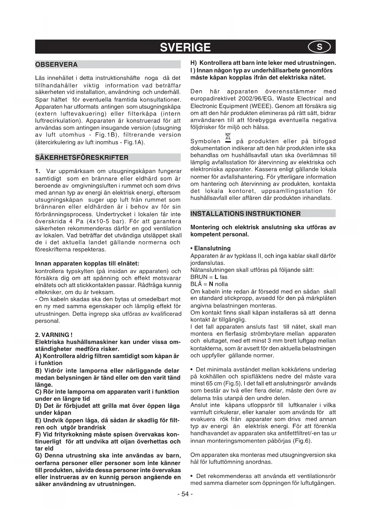 Таким образом можно избежать напрасного вызова техника, сэкономив на стоимости обслуживания. ФИРМА НЕ НЕСЕТ НИКАКОЙ ОТВЕТСТВЕННОСТИ ЗА УШЕРБ, ВЫЗВАННЫЙ НЕСОБЛЮДЕНИЕМ ВЫШЕПРИВЕДЕННЫХ ПРЕДУПРЕЖДЕНИЙ.- 54 - OBSERVERA Läs innehållet i detta instruktionshäfte noga då det tillhandahåller viktig information vad beträffar säkerheten vid installation, användning och underhåll. Spar häftet för eventuella framtida konsultationer. Apparaten har utformats antingen som utsugningskåpa (extern luftevakuering) eller filterkåpa (intern luftrecirkulation). Apparaten är konstruerad för att användas som antingen insugande version (utsugning av luft utomhus - Fig.1B), filtrerande version (återcirkulering av luft inomhus - Fig.1A).