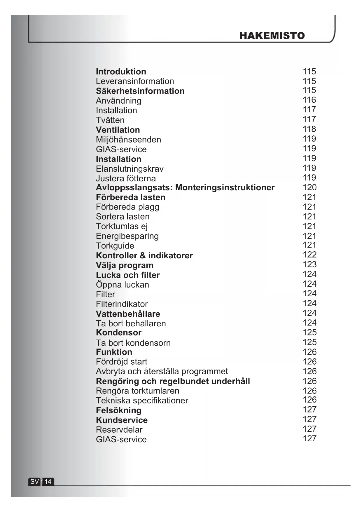 Introduktion Leveransinformation Säkerhetsinformation Användning Installation Tvätten Ventilation Miljöhänseenden GIAS-service Installation Elanslutningskrav Justera fötterna Avloppsslangsats: Monteringsinstruktioner Förbereda lasten Förbereda plagg Sortera lasten Torktumlas ej Energibesparing Torkguide Kontroller & indikatorer Välja program Lucka och filter Öppna luckan Filter Filterindikator Vattenbehållare Ta bort behållaren Kondensor Ta bort kondensorn Funktion Fördröjd start Avbryta och återställa programmet Rengöring och regelbundet underhåll Rengöra torktumlaren Tekniska specifikationer Felsökning Kundservice Reservdelar GIAS-serviceINTRODUKTION Användning Kontrollera att följande föremål medföljde apparaten: Ⴠ Bruksanvisning Ⴠ Garantisedel Ⴠ Energietikett Läs och följa dessa anvisningar noggrant och hantera maskinen i enlighet med dem. Detta häfte innehåller viktiga riktlinjer för säker användning, installation, underhåll och en del användbara råd för bästa resultat när du använder maskinen. Förvara all dokumentation på en säker plats för framtida referens eller för eventuella kommande ägare . Leveransinformation Underlåtenhet att följa ovanstående anvisningar kan sätta apparatens säkerhet ur spel. Om du får problem med maskinen och kontaktar service och det visar sig problemet beror på felaktig användning riskerar du att debiteras för samtalet. Kontrollera att maskinen inte skadats under transporten. Om den skadats kontaktar du GIAS. Säkerhetsinformation ჀProdukten får användas av barn över 8 års ålder och personer med nedsatt fysisk, sensorisk eller mental förmåga, eller som saknar nödvändig erfarenhet och kunskap, förutsatt att de får tillräckligt bistånd och anvisningar om säker användning och förstår vilka risker som finns. Låt inte barn leka med apparaten. Låt inte barn utföra rengöring eller underhåll utan tillsyn. Ⴠ VARNING Felaktig användning av en torktumlare kan orsaka brand. Ⴠ Den här apparaten är avsett för hushållsbruk och liknande användningsområden såsom: -i personalutrymmen i butiker, kontor och andra arbetsplatser; -lantbruk; -för gäster på hotell, motell och andra bostadsliknande miljöer; -på bed and breakfast-liknande inrättningar. Maskinen är inte avsedd för annan användning än vad som kan betecknas som normalt hushållsbruk, t.ex. kommersiell användning av experter eller professionella användare. Detta gäller även om användningen sker inom ovan nämnda användningsområden. Om apparaten används på ett annat sätt än det avsedda, kan livslängden påverkas och garantin upphöra att gälla. SV 115INTRODUKTION Användning Säkerhetsinformation Tillverkaren ansvarar inte för eventuella skador på maskinen eller annan skada eller förlust som uppstår på grund av användning som inte faller inom ramen för normalt hushållsbruk (även om maskinen placerats i en hushållsliknande miljö) i den fulla utsträckning som lagen tillåter. Ⴠ Maskinen får endast användas för avsett ändamål så som beskrivs I bruksanvisningen. Kontrollera att du förstår anvisningarna för installation och användning helt innan du börjar använda apparaten. Ⴠ Rör aldrig apparaten med våta eller fuktiga händer och fötter. Ⴠ Luta dig aldrig mot luckan när du fyller på maskinen och lyft eller flytta aldrig maskinen i luckan. Ⴠ Låt aldrig barn leka med maskinen eller dess kontroller. Ⴠ VARNING Använd inte produkten om luddfiltret inte sitter på plats eller om det är skadat. Luddet kan antändas. Ⴠ VARNING Där symbolen för varm yta sitter kan temperaturen under användning överstiga 60° C. Ⴠ Dra ut kontakten ur eluttaget. Dra alltid ut kontakten innan maskinen rengörs. Ⴠ Avbryt användningen av maskinen om den visar sig vara felaktig. Ⴠ Ludd får inte ansamlas på golvet runt maskinen. Ⴠ Trummans insida kan vara mycket varm. Låt alltid torktumlaren avsluta avkylningsperioden innan tvätten tas ut. Ⴠ Det sista steget under torkcykeln körs utan värme (avsvalning) för att säkerställa att temperaturen inte överstiger en nivå som skulle kunna skada textilierna. ჀMaximal last våt tvätt: se energimärkning 8 kg. ჀAnvänd inte torktumlaren för tvätt som rengjorts med industrikemikalier. Ⴠ VARNING: Om du stoppar torktumlaren innan torkcykeln slutförts måste alla textilier avlägsnas snabbt och hängas upp så att värmen snabbt går ur materialet. SV 116INTRODUKTION Säkerhetsinformation ჀKontrollera att produkten inte har några synliga skador föra användning. Om den är skadad bör du inte använda den. Kontakta GIAS-service. Ⴠ Använd inga adaptrar, förgreningsdosor och/eller förlängningar Ⴠ Placera aldrig torktumlaren så att den är i kontakt med t.ex. gardiner och se till att föremål inte kan falla ner eller samlas bakom maskinen. Ⴠ Apparaten får inte installeras bakom en låsbar dörr, en skjutdörr eller en dörr som har gångjärnet på andra sidan än torktumlaren. Installation Ⴠ Torka inte otvättade föremål I torktumlaren. Ⴠ VARNING Torktumla inte material som behandlats med kemtvättvätskor. Ⴠ VARNING Skumgummimaterial kan, under vissa förhållanden, självantända när de hettas upp. Föremål som skumgummi (latexskum), badmössor, vattentäta textilier, artiklar med gummibaksidor och plagg eller kuddar fyllda med skumgummikuddar FÅR INTE torkas i torktumlaren. Ⴠ Se alltid tvättråden för information om lämplighet för torktumling. Tvätten Ⴠ Plagg måste centrifugeras eller vridas ur noga innan de placeras I torktumlaren. Plagg som är droppvåta får INTE placeras i tumlaren. Ⴠ Cigarettändare och tändstickor får inte lämnas kvar i fickor och eldfarliga vätskor får ALDRIG användas i närheten av maskinen. Ⴠ Glasfibergardiner får INTE placeras i maskinen. Hudirritation kan uppstå om plagg förorenas med glasfibrerna. Ⴠ Föremåll som har smutsats ned med t.ex. m