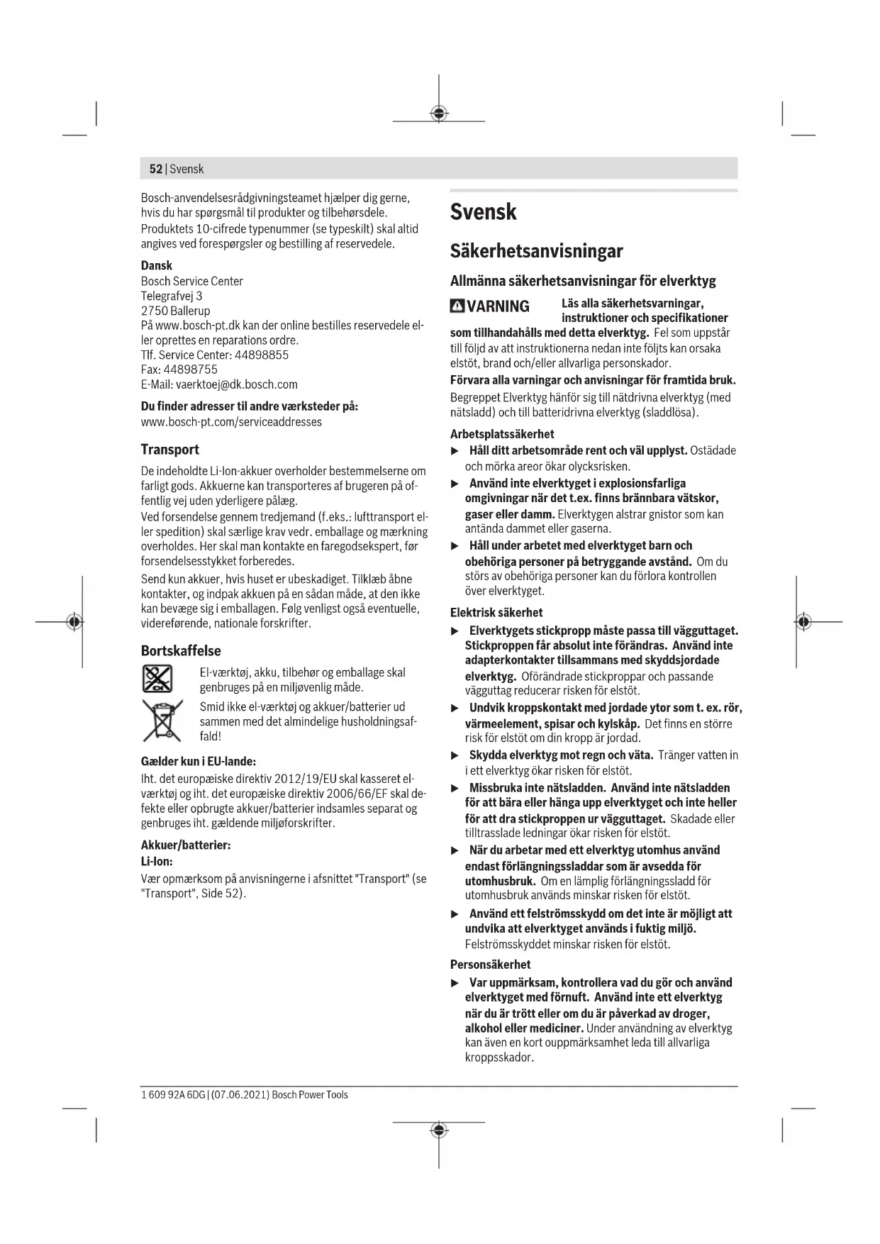 Spænd muffen på den selvspændende borepatron (2) hårdt i rotationsretning ➋ med hånden, indtil der høres en kliklyd. Borepatronen låses derefter automatisk. Låsen løsnes igen, hvis du drejer muffen med uret, når du vil fjerne værktøjet. Støv-/spånudsugning Støv fra materialer som f.eks. blyholdig maling, nogle træ- sorter, mineraler og metal kan være sundhedsfarlige. Berø- ring eller indånding af støv kan føre til allergiske reaktioner og/eller åndedrætssygdomme hos brugeren eller personer, der opholder sig i nærheden af arbejdspladsen. 1 609 92A 6DG | (07.06.2021) Bosch Power ToolsDansk | 51 Bestemt støv som f.eks. ege- eller bøgestøv gælder som kræftfremkaldende, især i forbindelse med ekstra stoffer til træbehandling (chromat, træbeskyttelsesmiddel). Asbest- holdigt materiale må kun bearbejdes af fagfolk. – Sørg for god udluftning af arbejdspladsen. – Det anbefales at bære åndeværn med filterklasse P2. Overhold forskrifterne, der gælder i dit land vedr. de materi- aler, der skal bearbejdes. u Undgå at der samler sig støv på arbejdspladsen. Støv kan let antænde sig selv. Brug Ibrugtagning Isætning af akku Bemærk: Hvis der anvendes akkuer, som ikke er godkendt til dit el-værktøj, kan det resultere i fejlfunktion eller ødelæg- gelse af el-værktøjet. Sæt retningsomskifteren (11) i midten for at forhindre en utilsigtet start. Isæt den opladede akku (8) i grebet, indtil den går mærkbart i indgreb og ligger helt an mod grebet. Indstilling af drejeretning (se billede C) Med retningsomskifteren (11) kan du ændre el-værktøjets drejeretning. Ved nedtrykket start-stop-kontakt (12) er det- te imidlertid ikke muligt. Højreløb: Ved boring og iskruning af skruer skal du skubbe drejeretningsomskifteren (11) til venstre til anslag. Drejeretningsindikatoren for højreløb (5) lyser ved aktiveret tænd-/sluk-kontakt (12) og kørende mo- tor. Venstreløb: Til løsning og uddrejning af skruer og møtrikker trykkes retningsomskifteren (11) helt mod højre. Drejeretningsindikatoren for venstreløb (6) lyser ved aktiveret tænd-/sluk-kontakt (12) og kørende motor. Forvalg af drejningsmoment Med indstillingsringen til forvalg af drejningsmoment (3) kan du forvælge det nødvendige drejningsmoment i 20trin. Ved den korrekte indstilling standser indsatsværktøjet, så snart skruen er skruet ind, eller det indstillede drejningsmoment er nået. I positionen er beskyttelseskoblingen deakti- veret, f.eks. ved boring. Vælg eventuelt en højere indstilling ved udskruning af skru- er, eller indstil på symbolet . Mekanisk gearvalg u Aktivér kun gearvælgeren (4), når elværktøjet står stille. Med gearvælgeren (4) kan du forvælge 2 omdrejningstalom- råder. Gear I: Lavt omdrejningstalsområde; til skruning eller til arbejde med store bordiametre. Gear II: Højt omdrejningstalsområde; til arbejde med små bordiame- tre. Hvis gearomskifteren (4) ikke kan skubbes til anslaget, skal du dreje værktøjsholderen (1) et stykke med indsatsværktø- jet. Temperaturafhængig overbelastningsbeskyttelse Ved korrekt brug kan el-værktøjet ikke blive overbelastet. Ved for kraftig belastning eller overskridning af den tilladte batteri-temperatur afbryder el-værktøjets elektronik, indtil værktøjet igen befinder sig i det optimal driftstemperatur- område. Tænd/sluk Til ibrugtagning af el‑værktøjet tryk på start-stop-kontakten (12) og hold den nede. Lampen (9) lyser, når tænd/sluk-knappen (12) er trykket let eller helt ned, så arbejdsområdet kan oplyses under dårlige lysforhold. El‑værktøjet slukkes ved at slippe start-stop-kontakten (12) igen. Indstil omdrejningstal Du kan regulere omdrejningstallet på det tændte el-værktøj trinløst afhængigt af, hvor langt du trykker start-stop-kontak- ten (12) ind. Let tryk på start-stop‑kontakten (12) fører til et lavt omdrej- ningstal. Med tiltagende tryk øges omdrejningstallet. Arbejdsvejledning u Sæt kun el-værktøjet på møtrikken/skruen i slukket tilstand. Roterende indsatsværktøjer kan skride. Efter længere tids arbejde med lavt omdrejningstal bør du lade el-værktøjet køle af ved at køre i tomgang med maksi- malt omdrejningstal i ca. 3 minutter. Vedligeholdelse og service Vedligeholdelse og rengøring u Tag altid akkuen ud af el‑værktøjet, før der arbejdes på el‑værktøjet (f.eks. vedligeholdelse, værktøjsskift osv.) samt før det transporteres og lægges til opbeva- ring. Utilsigtet aktivering af start-stop-kontakten er for- bundet med kvæstelsesfare. u El‑værktøj og el‑værktøjets ventilationsåbninger skal altid holdes rene for at sikre et godt og sikkert ar- bejde. Efter brug: Rengør altid indsatsværktøjet, værktøjsholderen og ventilationsåbningerne på el-værktøjet samt ventilations- åbningerne på akkuen. Kundeservice og anvendelsesrådgivning Kundeservice besvarer dine spørgsmål vedr. reparation og vedligeholdelse af dit produkt samt reservedele. Eksplo- sionstegninger og oplysninger om reservedele finder du også på: www.bosch-pt.com Bosch Power Tools 1 609 92A 6DG | (07.06.2021)52 | Svensk Bosch-anvendelsesrådgivningsteamet hjælper dig gerne, hvis du har spørgsmål til produkter og tilbehørsdele. Produktets 10‑cifrede typenummer (se typeskilt) skal altid angives ved forespørgsler og bestilling af reservedele. Dansk Bosch Service Center Telegrafvej 3 2750 Ballerup På www.bosch-pt.dk kan der online bestilles reservedele el- ler oprettes en reparations ordre. Tlf. Service Center: 44898855 Fax: 44898755 E-Mail: vaerktoej@dk.bosch.com Du finder adresser til andre værksteder på: www.bosch-pt.com/serviceaddresses Transport De indeholdte Li-Ion-akkuer overholder bestemmelserne om farligt gods. Akkuerne kan transporteres af brugeren på of- fentlig vej uden yderligere pålæg. Ved forsendelse gennem tredjemand (f.eks.: lufttransport el- ler spedition) skal særlige krav vedr. emballage og mærkning overholdes. Her skal man kontakte en fa