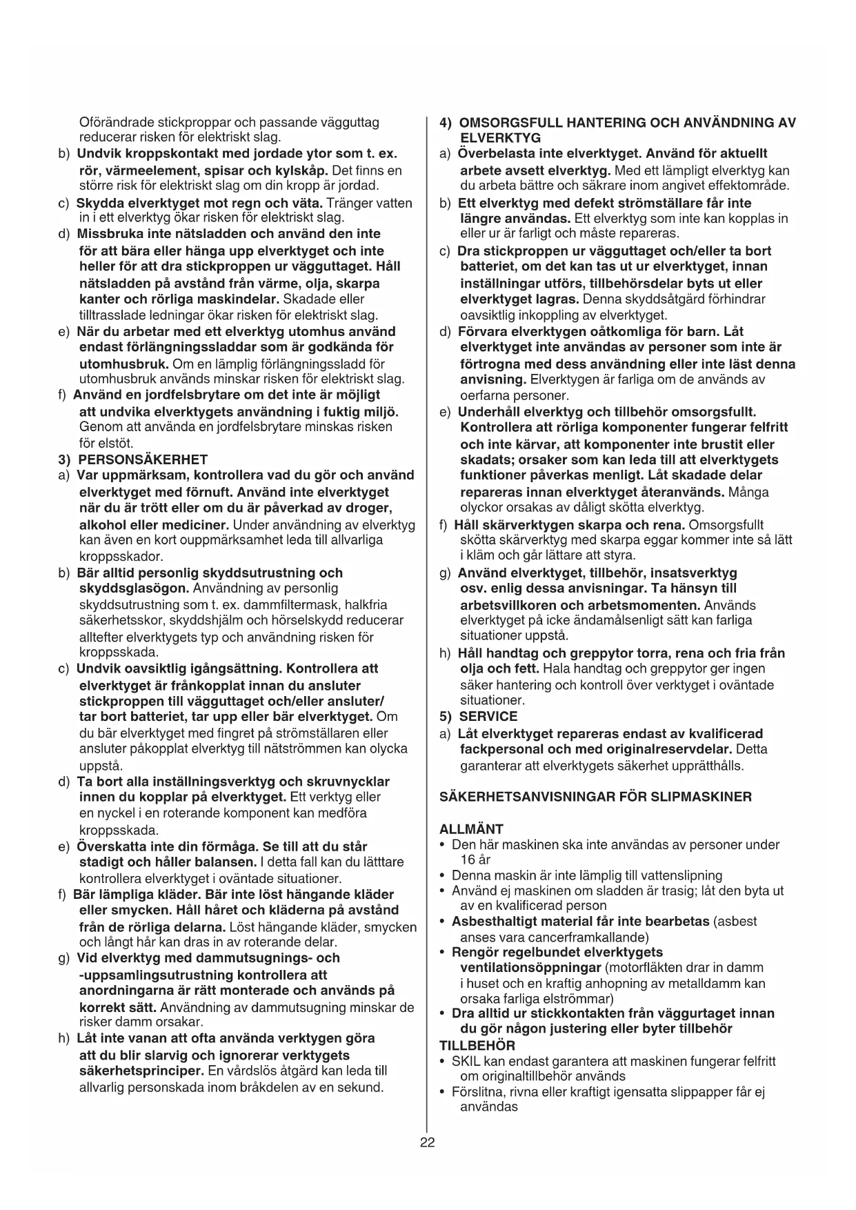 - Vid slipning av metall bildas gnistor; använd inte dammsugare och håll andra personer och antändbart material på avstånd från arbetsområdet