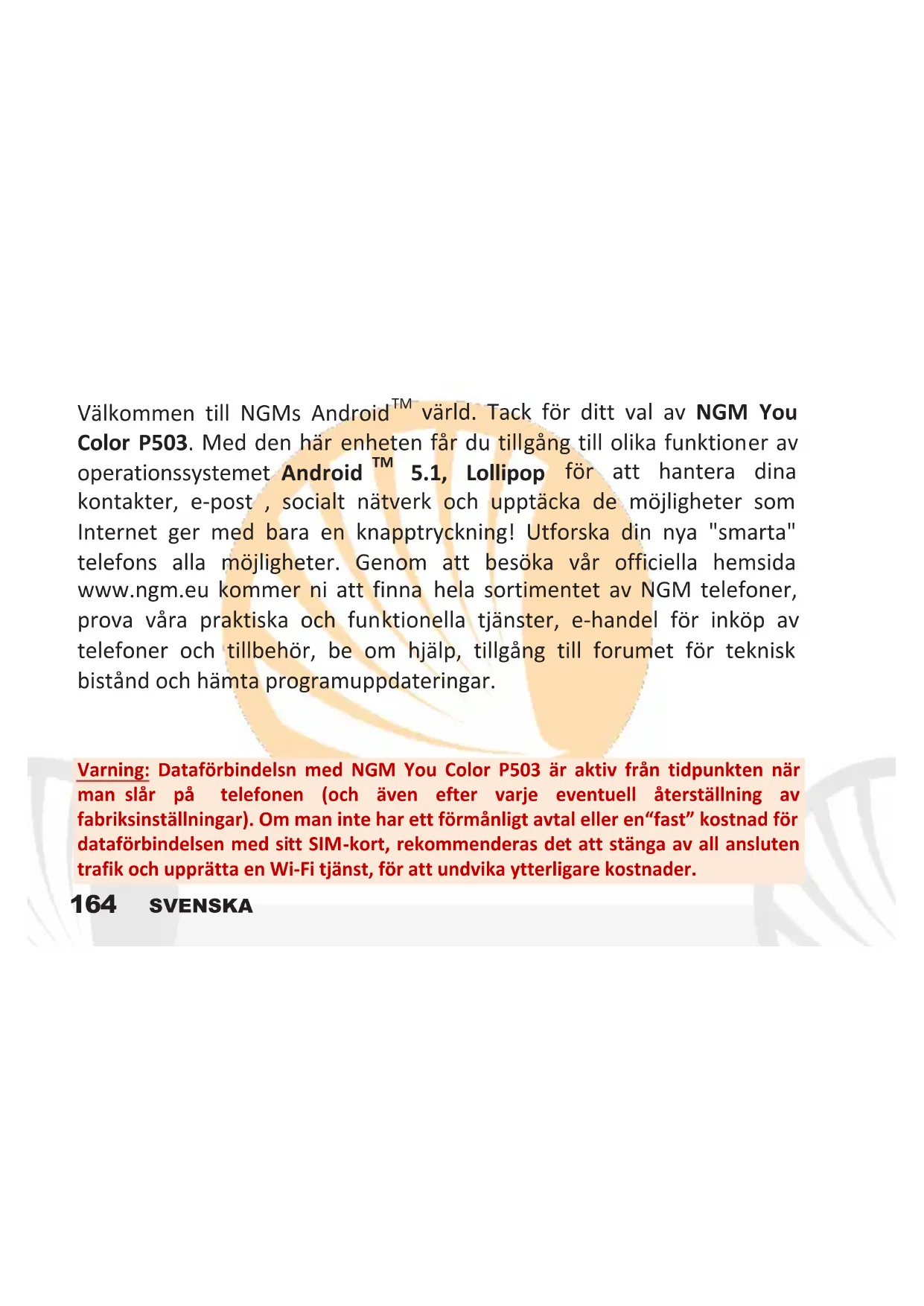 Välkommen till NGMs Android™ värld. Tack für ditt val av NGM You Color P503. Med den har erhoten fär du tillgang till olika functioner av operationssystemet Android™ 5.1, Lollipop für att hantera din kontakter, e-post, socialt natverk och upptäcka de möjligheter som Internet ger med bara en knaptryckning! Utforska dinnya "smarta" Telefona alla möjligheter. Genom att besöka.Var officiella hemsida www.ngm.eu kommt ni att finna hela sortimentet av NGM Telefoner, provavara praktiska och Funktionella tjänster, e-handel for inkop av Telefoner och tillbehör, be om hjälp, tillgang till forumet for teknik biständ och hamta programupppateringar.