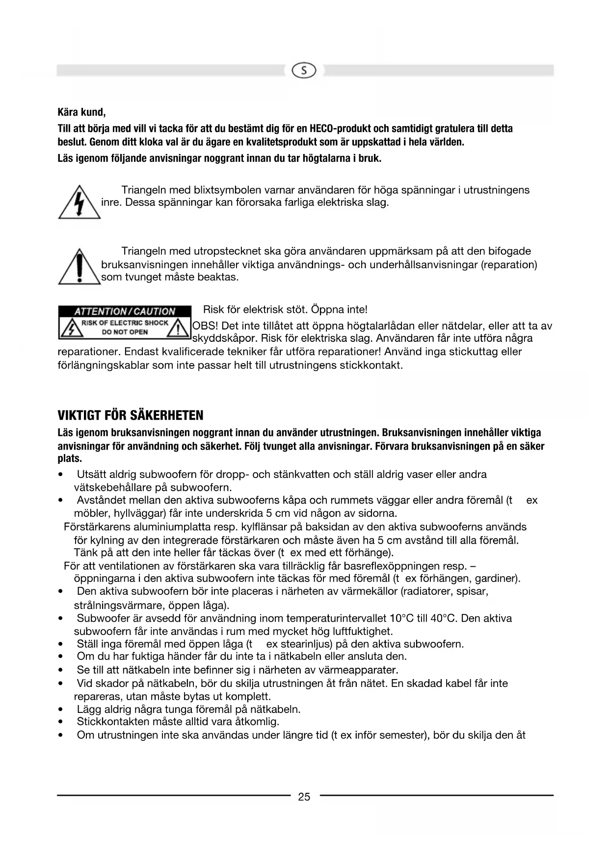 Kära kund, Till att börja med vill vi tacka för att du bestämt dig för en HECO-produkt och samtidigt gratulera till detta beslut. Genom ditt kloka val är du ägare en kvalitetsprodukt som är uppskattad i hela världen. Läs igenom följande anvisningar noggrant innan du tar högtalarna i bruk. Triangeln med blixtsymbolen varnar användaren för höga spänningar i utrustningens inre. Dessa spänningar kan förorsaka farliga elektriska slag. Triangeln med utropstecknet ska göra användaren uppmärksam på att den bifogade bruksanvisningen innehåller viktiga användnings- och underhållsanvisningar (reparation) som tvunget måste beaktas. Risk för elektrisk stöt. Öppna inte! OBS! Det inte tillåtet att öppna högtalarlådan eller nätdelar, eller att ta av skyddskåpor. Risk för elektriska slag. Användaren får inte utföra några reparationer. Endast kvalicerade tekniker får utföra reparationer! Använd inga stickuttag eller förlängningskablar som inte passar helt till utrustningens stickkontakt. viktigt För SäkerheteN Läs igenom bruksanvisningen noggrant innan du använder utrustningen. Bruksanvisningen innehåller viktiga anvisningar för användning och säkerhet. Följ tvunget alla anvisningar. Förvara bruksanvisningen på en säker plats.