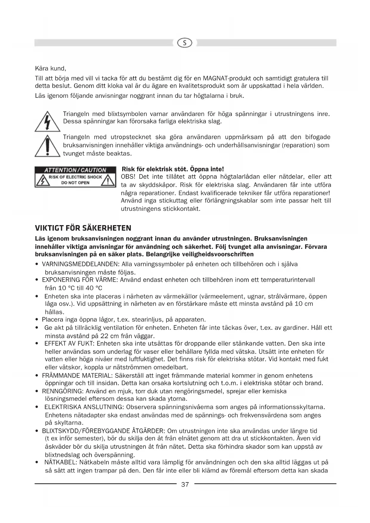 Configuração: Subwoofer activo bassreflex, princípio downfire Equipamento Estágio excitador de curso longo de 38 cm Capacidade de saída RMS / Máx.: 150 / 300 Watt Faixa de frequência: 17...200 Hz Frequência de separação: 50...150 Hz regulável Dimensões (LxAxP): 458 x 545 x 620 mm Acessórios: Cabo de ligação à rede RESERVADOS OS DIREITOS DE ALTERAÇÕES TÉCNICAS.37 Kära kund, Till att börja med vill vi tacka för att du bestämt dig för en MAGNAT-produkt och samtidigt gratulera till detta beslut. Genom ditt kloka val är du ägare en kvalitetsprodukt som är uppskattad i hela världen. Läs igenom följande anvisningar noggrant innan du tar högtalarna i bruk. Triangeln med blixtsymbolen varnar användaren för höga spänningar i utrustningens inre. Dessa spänningar kan förorsaka farliga elektriska slag. Triangeln med utropstecknet ska göra användaren uppmärksam på att den bifogade bruksanvisningen innehåller viktiga användnings- och underhållsanvisningar (reparation) som tvunget måste beaktas. Risk för elektrisk stöt. Öppna inte! OBS! Det inte tillåtet att öppna högtalarlådan eller nätdelar, eller att ta av skyddskåpor. Risk för elektriska slag. Användaren får inte utföra några reparationer. Endast kvalificerade tekniker får utföra reparationer! Använd inga stickuttag eller förlängningskablar som inte passar helt till utrustningens stickkontakt.