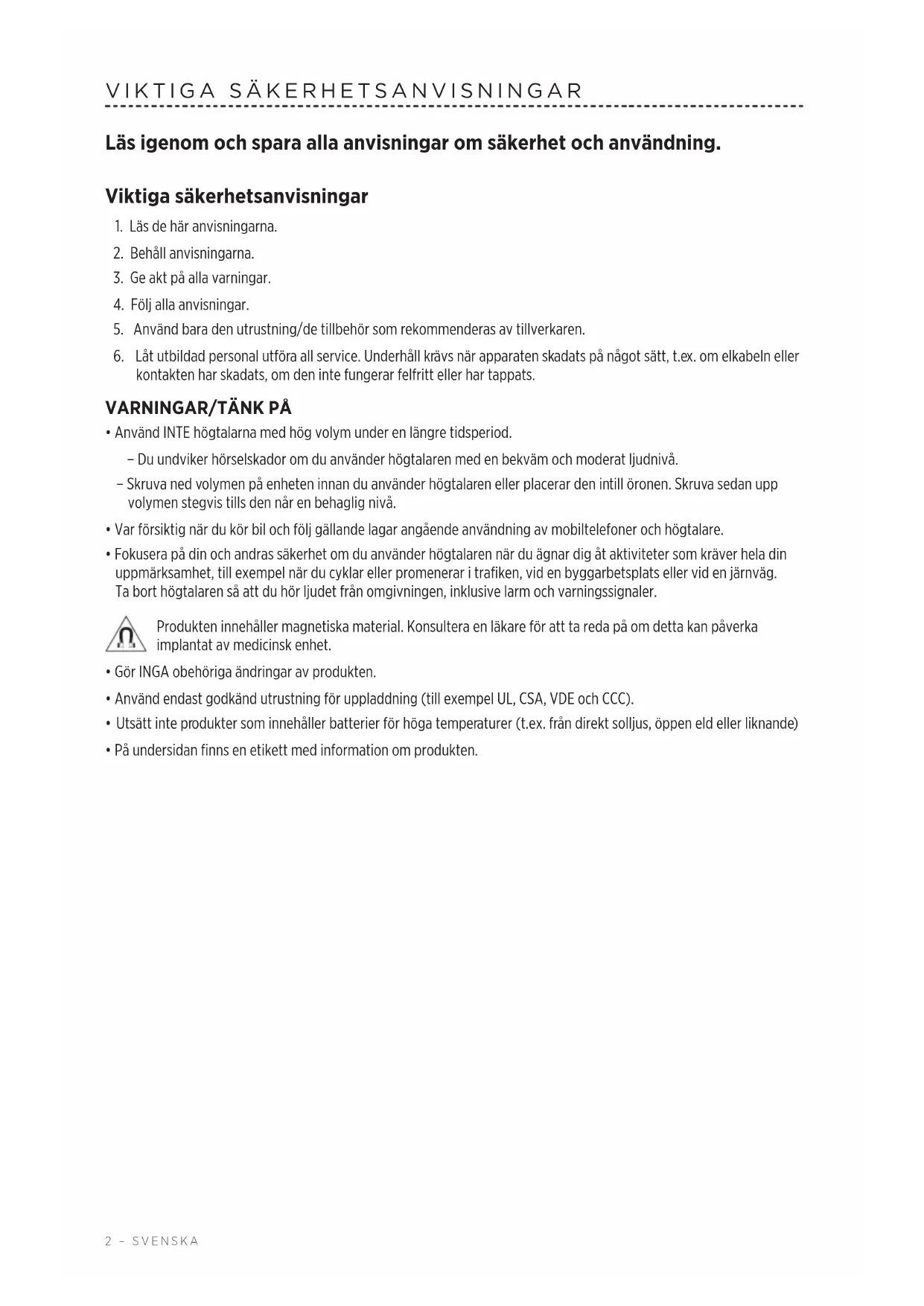 - Fokusera på din och andras säkerhet om du använder högtalaren när du ägnar dig åt aktiviteter som kräver hela din uppmärksamhet, till exempel när du cyklar eller promenerar i trafiken, vid en byggarbetsplats eller vid en järnväg. Tabort högtalaren så att du hör ljudet från omgivningen, inklusive larm och varningssignaler. Produkten innehåller magnetiska material. Konsultera en läkare för att ta reda på om detta kan påverka implantat av medicinsk enhet.