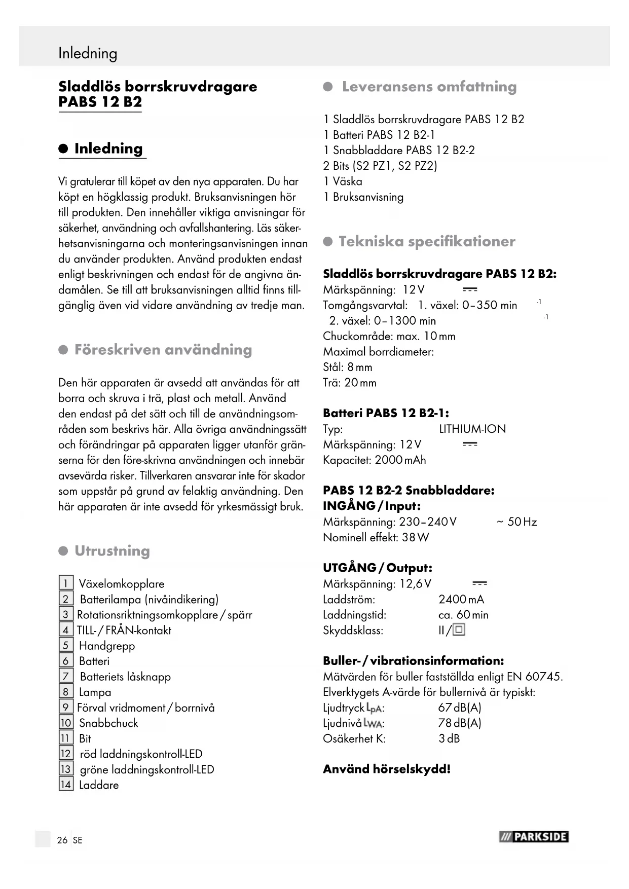 BRUKSANVISNING PABS 12 B2 PARKSIDE