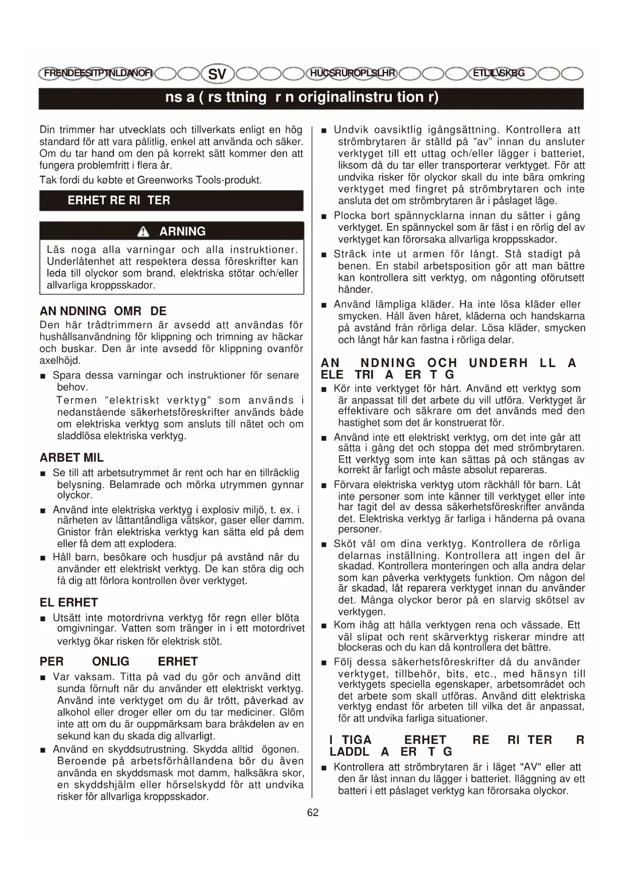 FR EN DE ES IT PT NL DA NO FI HU CS RU RO PL SL HR HU CS RU RO PL SL HR ET LT LV SK BG ET LT LV SK BG Din trimmer har utvecklats och tillverkats enligt en hög standard för att vara pålitlig, enkel att använda och säker. Om du tar hand om den på korrekt sätt kommer den att fungera problemfritt i flera år. Tak fordi du købte et Greenworks Tools-produkt.